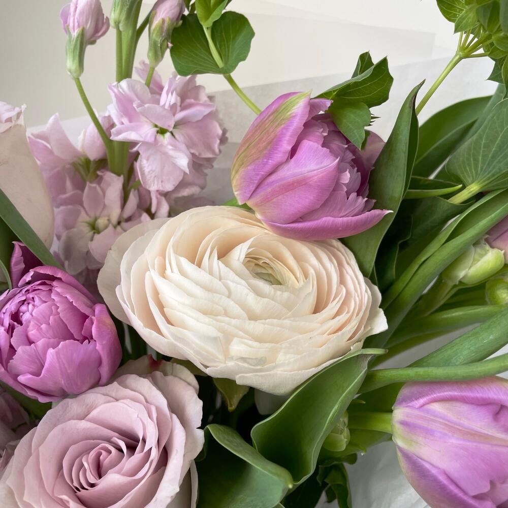 Маттиола – 3 шт.Роза – 2 шт.Зелень – 1 шт.Ранункулюс – 1 шт.Тюльпан пионовидный – 4 шт.