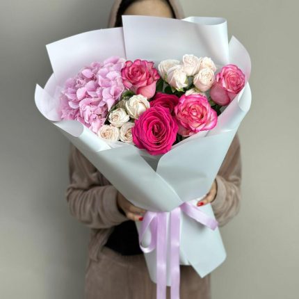 Незабываемый букет из королевской гортензий и 11 белых роз для ценителей стиля и красоты