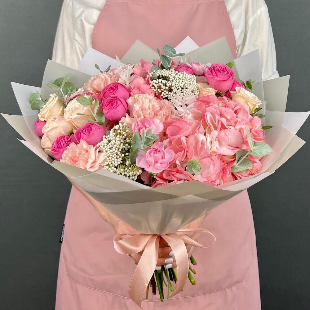 Авторский букет из розовых Гортензий и кустовых пионовидны Роз