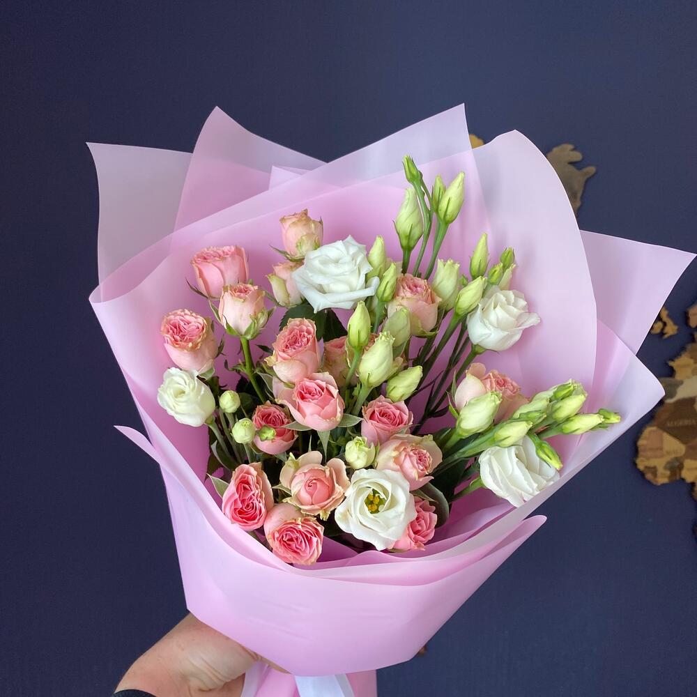 Авторский букет с кустовой розой и лизиантусом