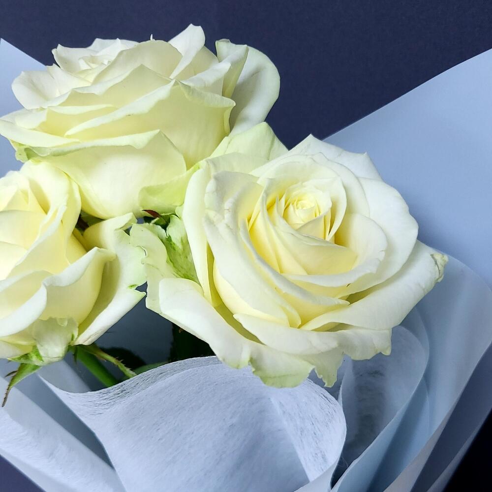 белые розы 50 см – 3 шт.Крафт упаковка – 1 шт.Лента атласная – 1 шт.