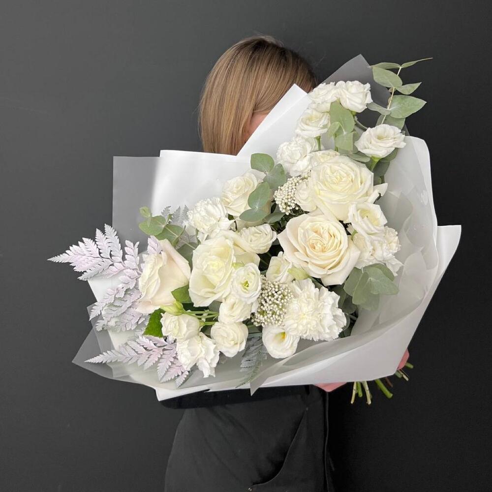Лизиантус – 2 шт.Озотамнус – 2 шт.Эвкалипт – 2 шт.Диантус – 6 шт.Фисташка – 3 шт.Упаковка дизайнерская – 3 шт.Ледерварен – 2 шт.Эквадор роза – 5 шт.