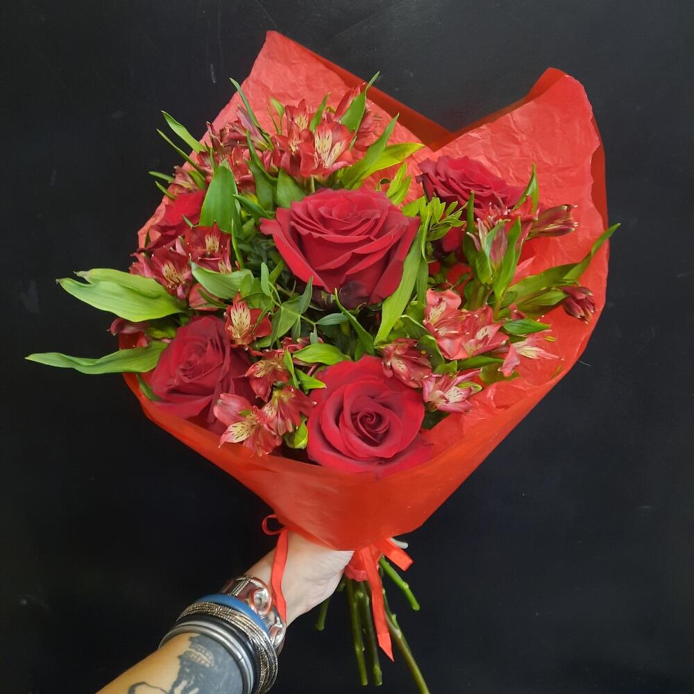 Бордовые розы с альстромерией