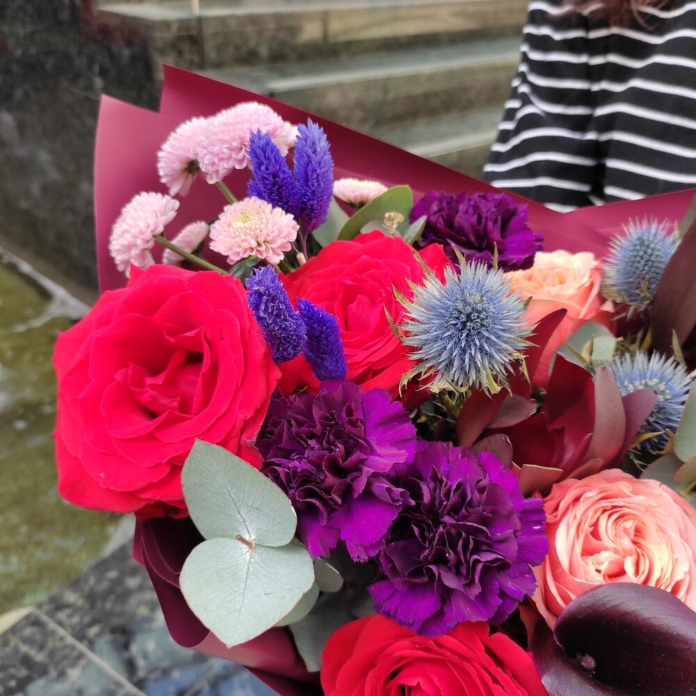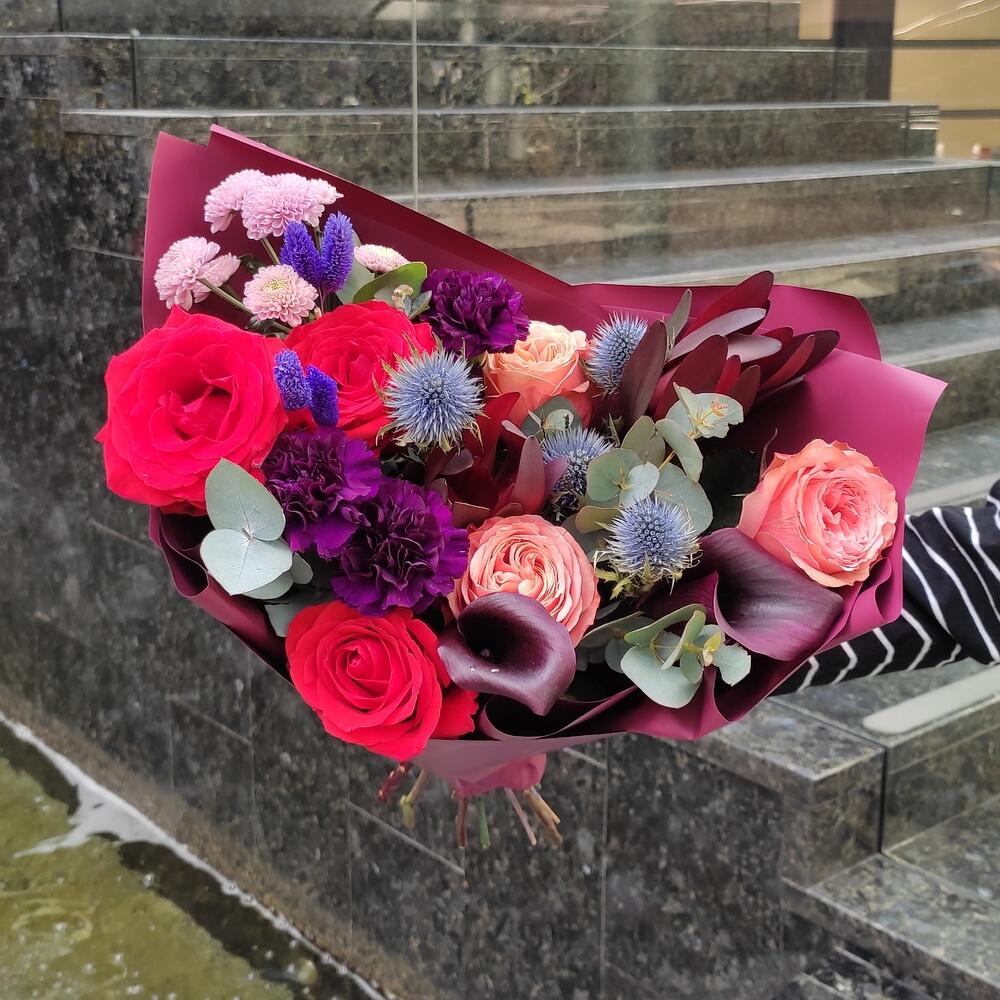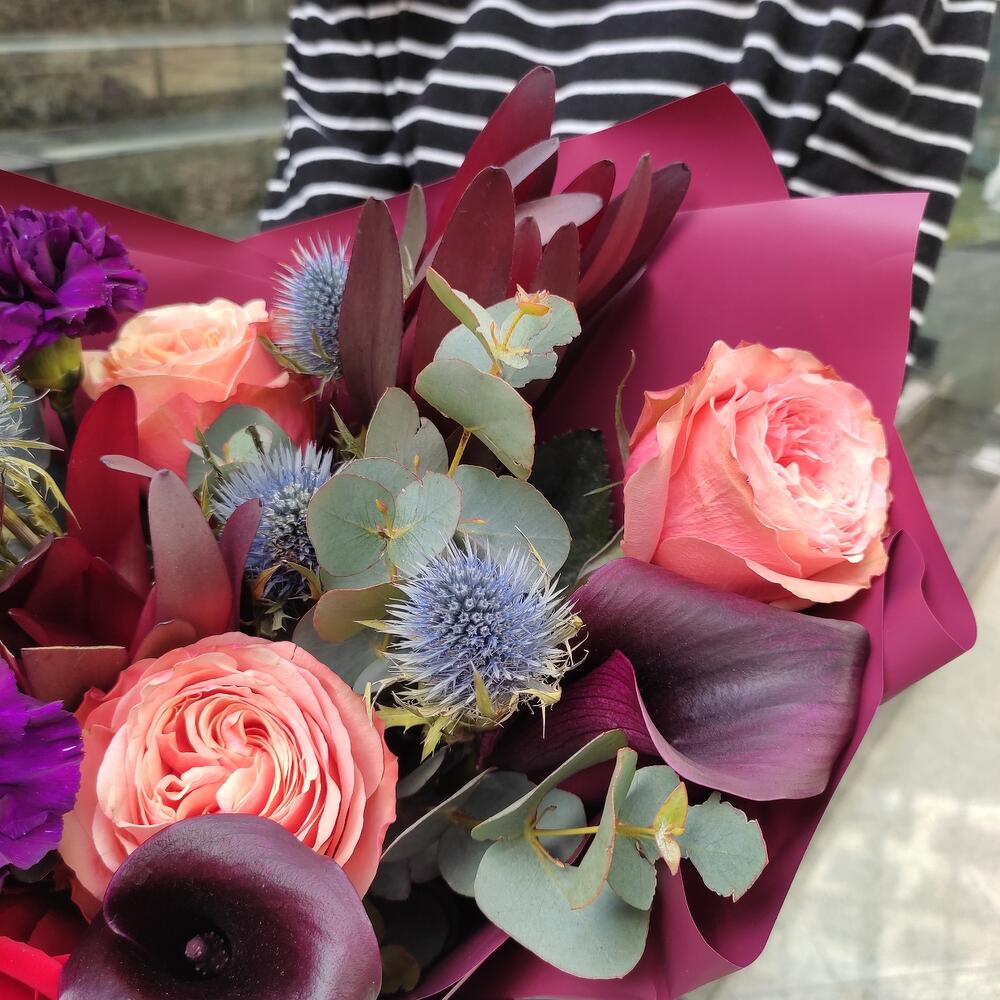Роза кахала – 3 шт.Роза красная – 3 шт.Диантус – 3 шт.Фаларис – 10 шт.эваклипт – 3 шт.Эрингиум – 1 шт.леокендрон – 2 шт.Упаковка дизайнерская – 1 шт.Лента атласная – 2 шт.калла черничная – 2 шт.
