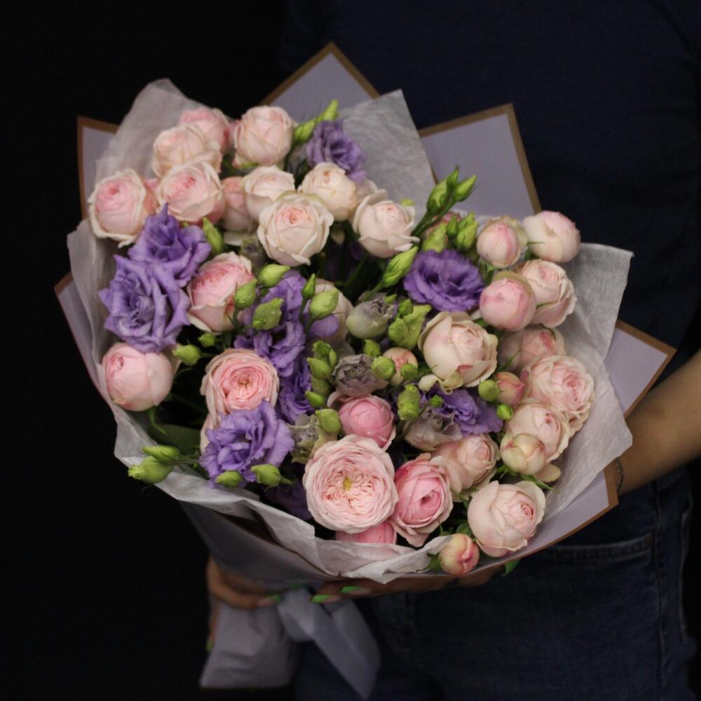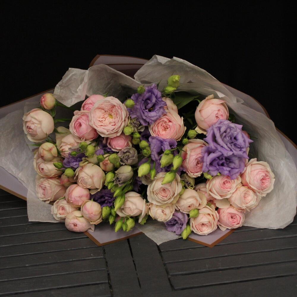 роза пинк менсфилд – 7 шт.эустома лавандовая – 5 шт.Тишью – 2 шт.Пленка матовая – 3 шт.Лента атласная – 2 шт.