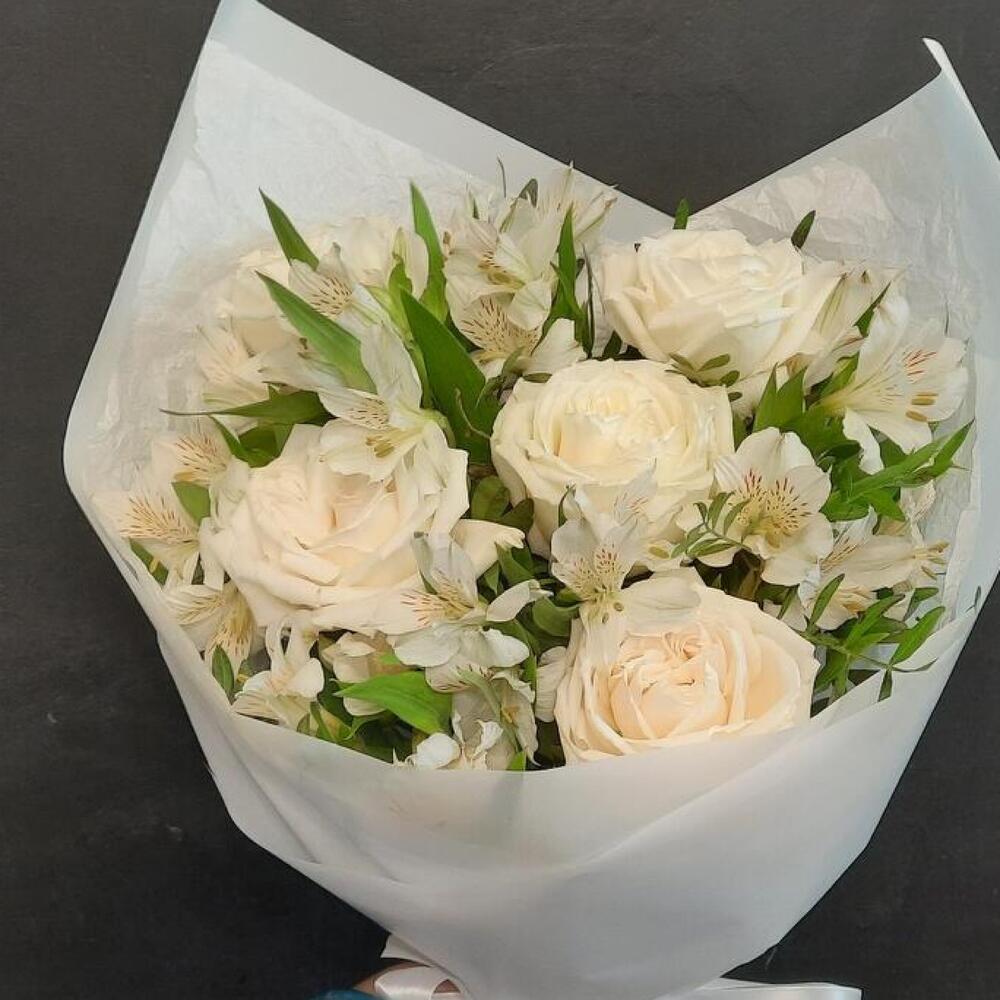 Букет из белых роз и белой алтстромерии в дизайнерской упаковке