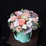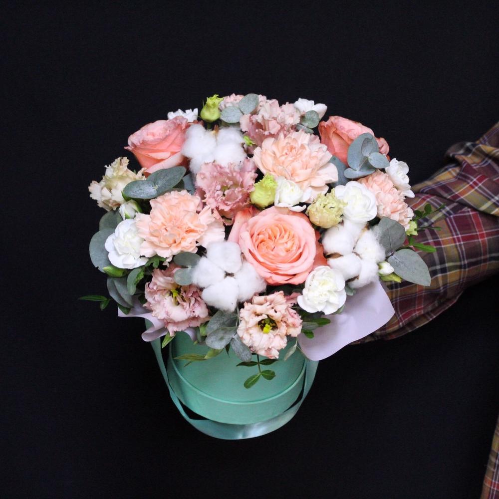Эвкалипт – 3 шт.Эустома – 2 шт.Диантус – 4 шт.Коробка шляпная – 1 шт.Фисташка – 1 шт.эустома розита вайт – 1 шт.Пленка матовая – 1 шт.Оазис флористический – 1 шт.Хлопок натуральный – 3 шт.Роза пионовидная кахала – 3 шт.