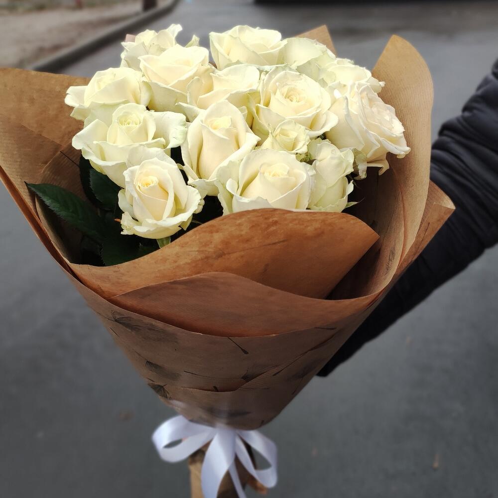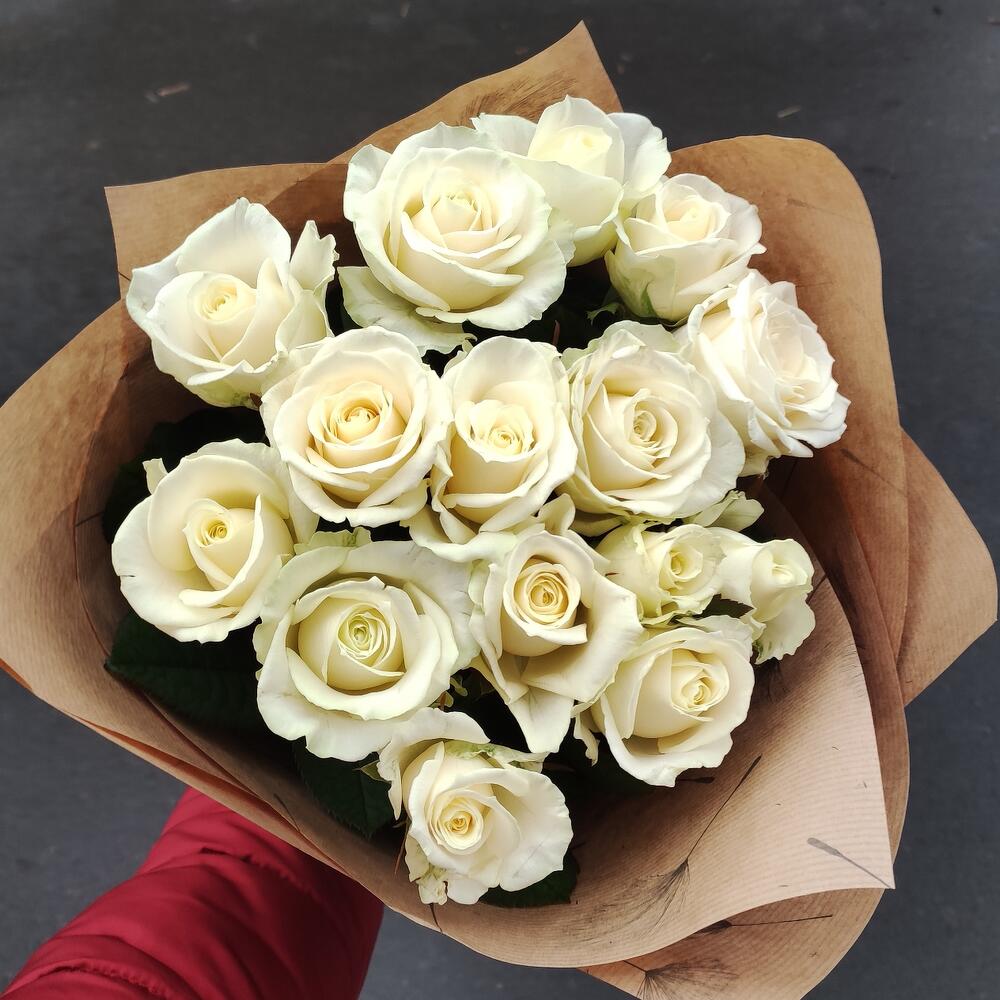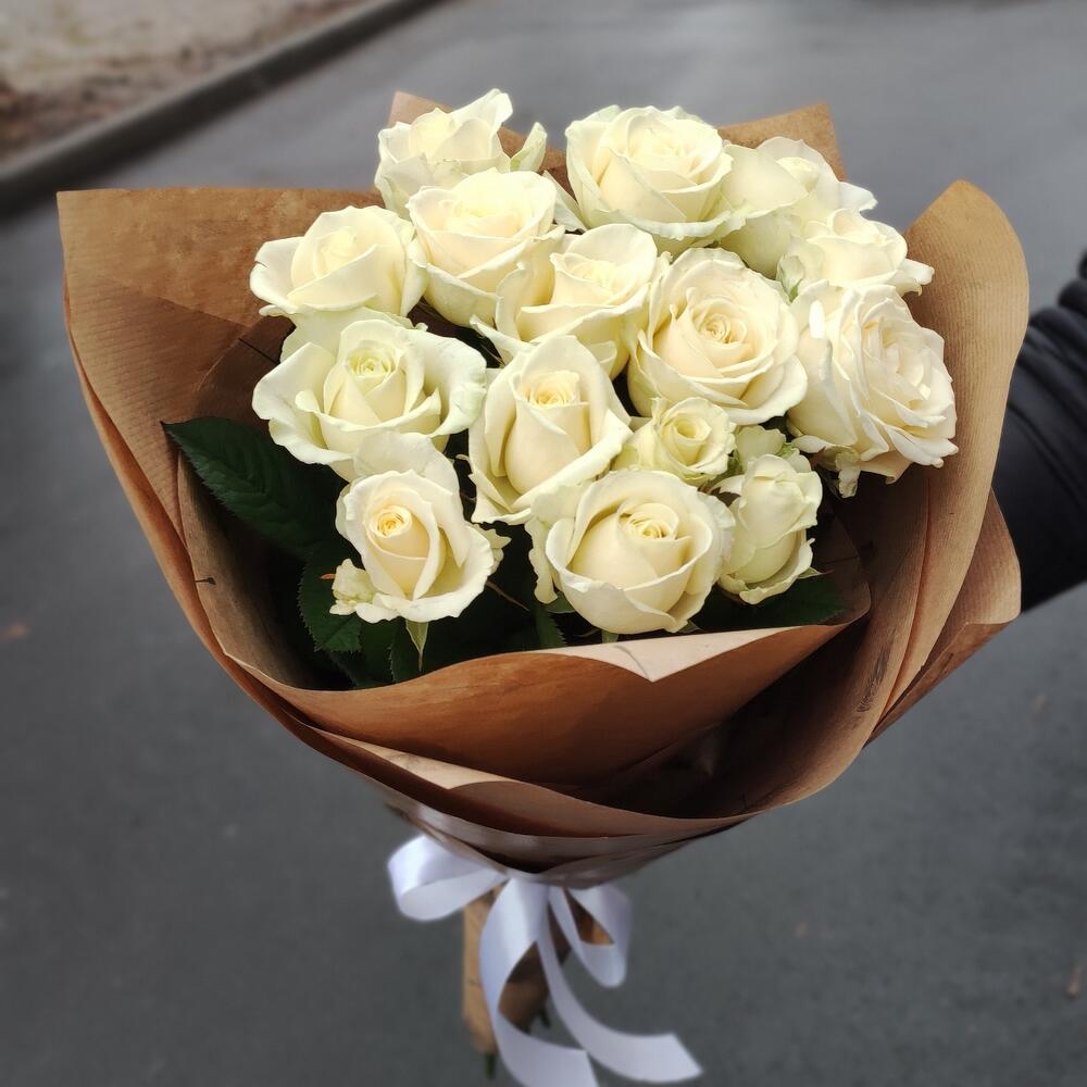 роза украинская белая – 15 шт. оформление крафт бумага – 1 шт.