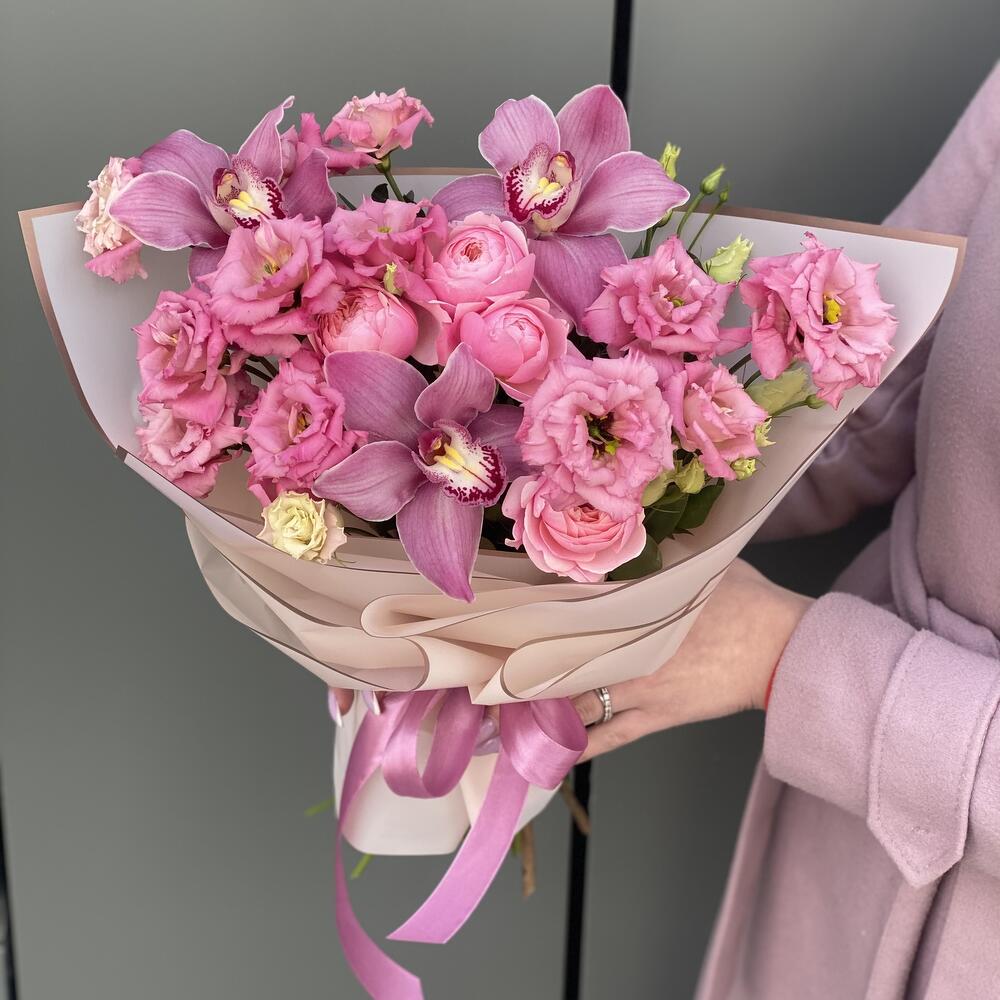 Сборный букет из кружевной эустомы сорта Алиса Роуз, цветков орхидеи и кустовой пионовидной розы в оформлении!