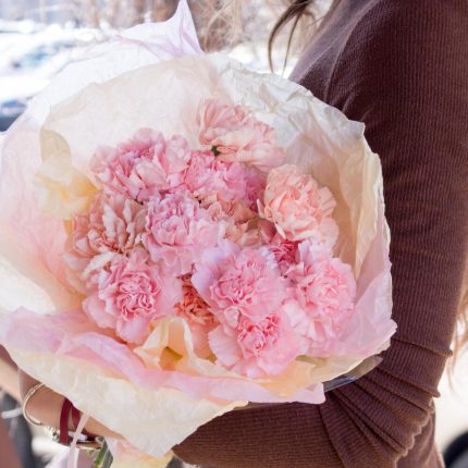 Кустовая пионовидная роза – 5 шт. Гвоздика персиковая – 3 шт. Авторская упаковка – 1 шт. шармелия – 2 шт.