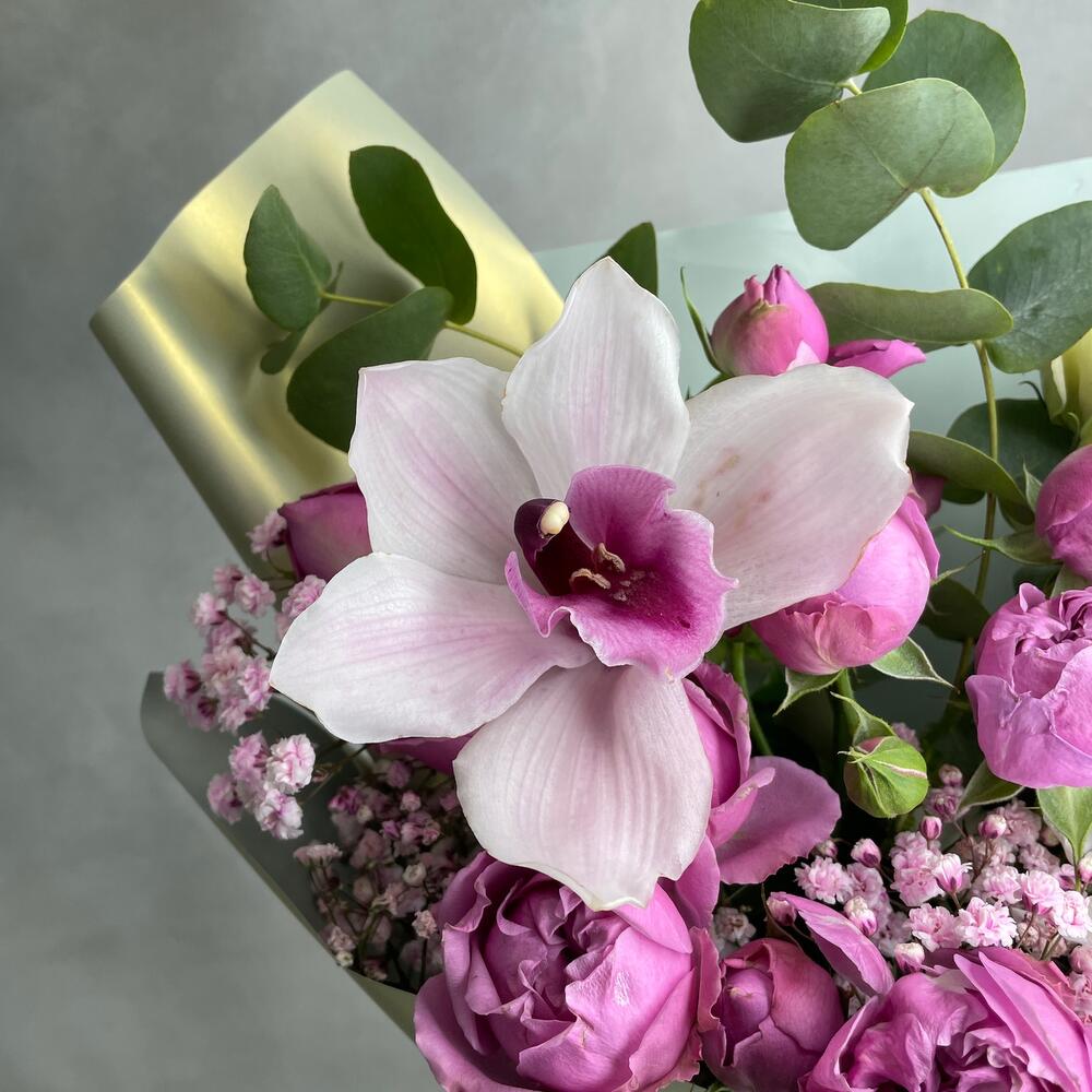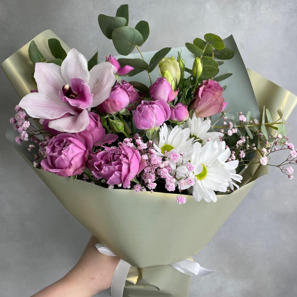 Гипсофила – 1 шт.Орхидея Цимбидиум – 1 шт.Хризантема кустовая – 1 шт.Эвкалипт – 2 шт.Роза кустовая пионовидная – 1 шт.Упаковка дизайнерская – 1 шт.Лизиантус – 1 шт.