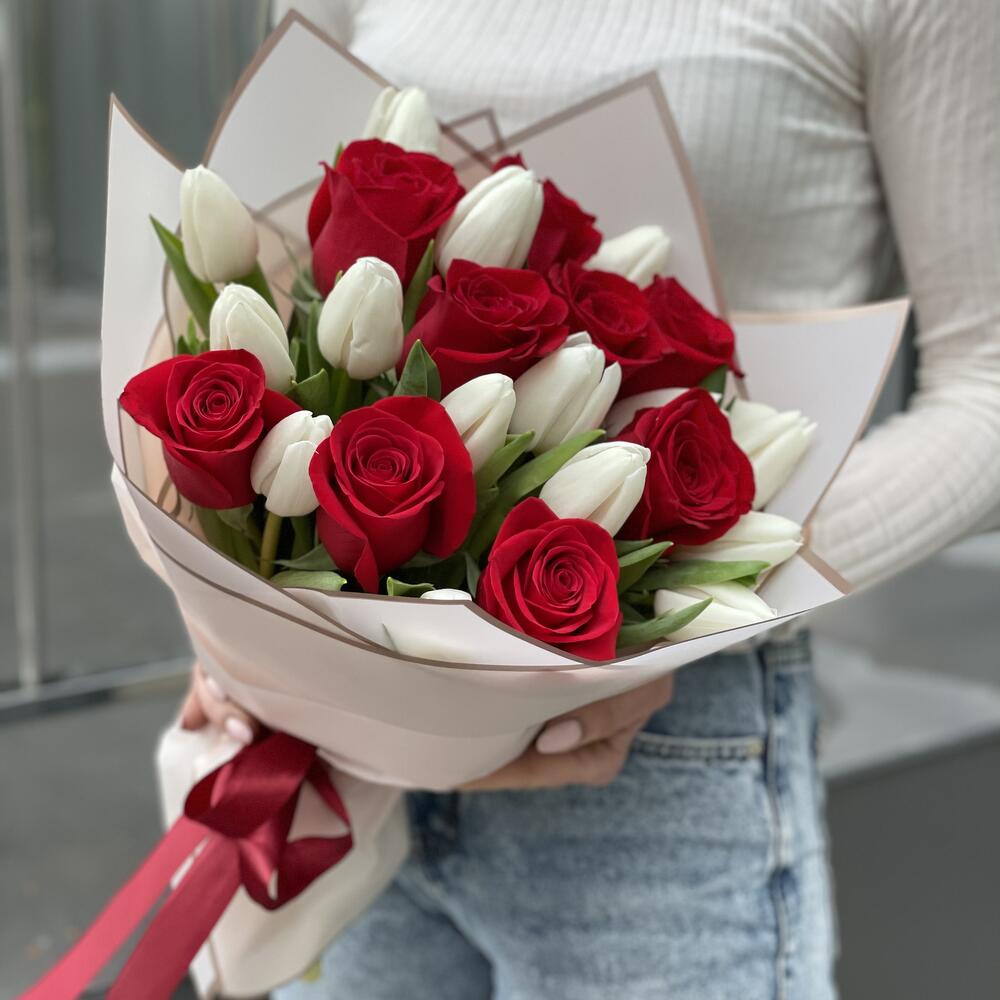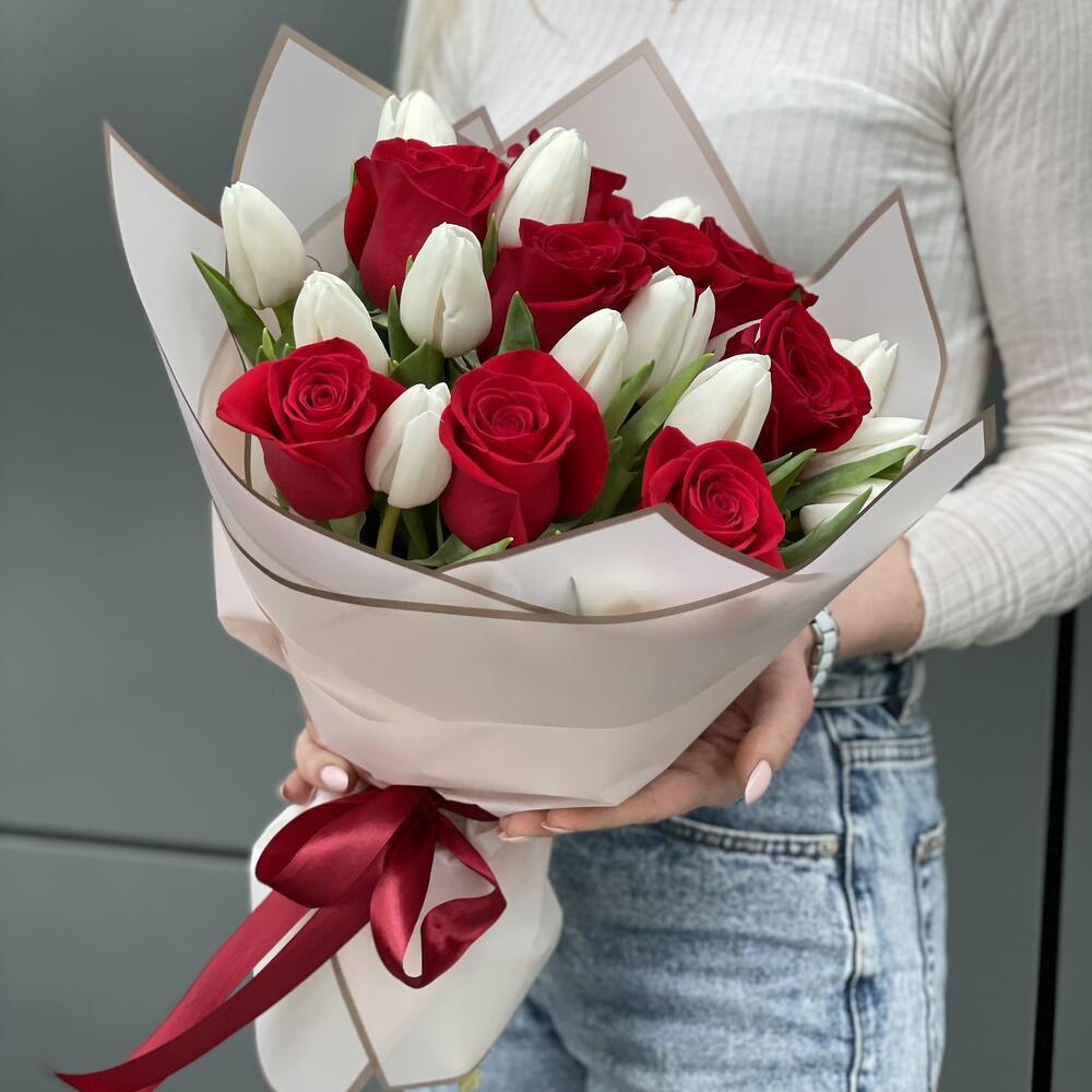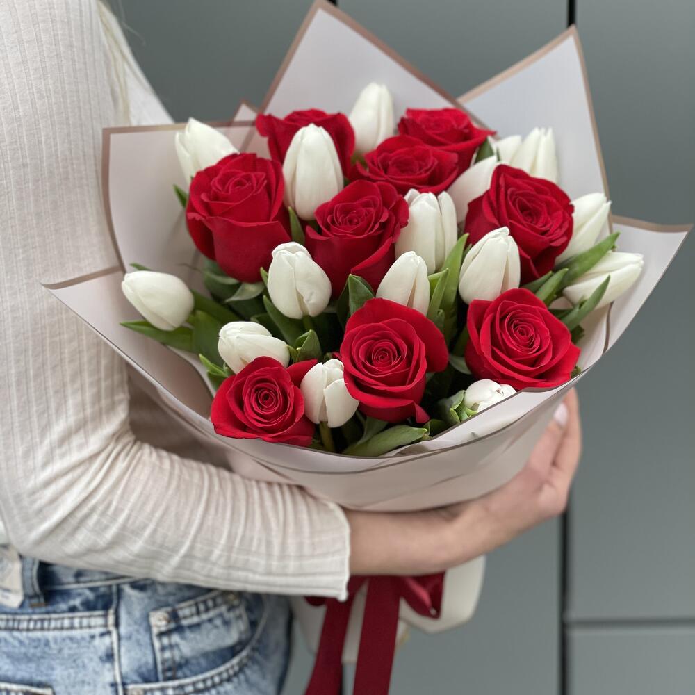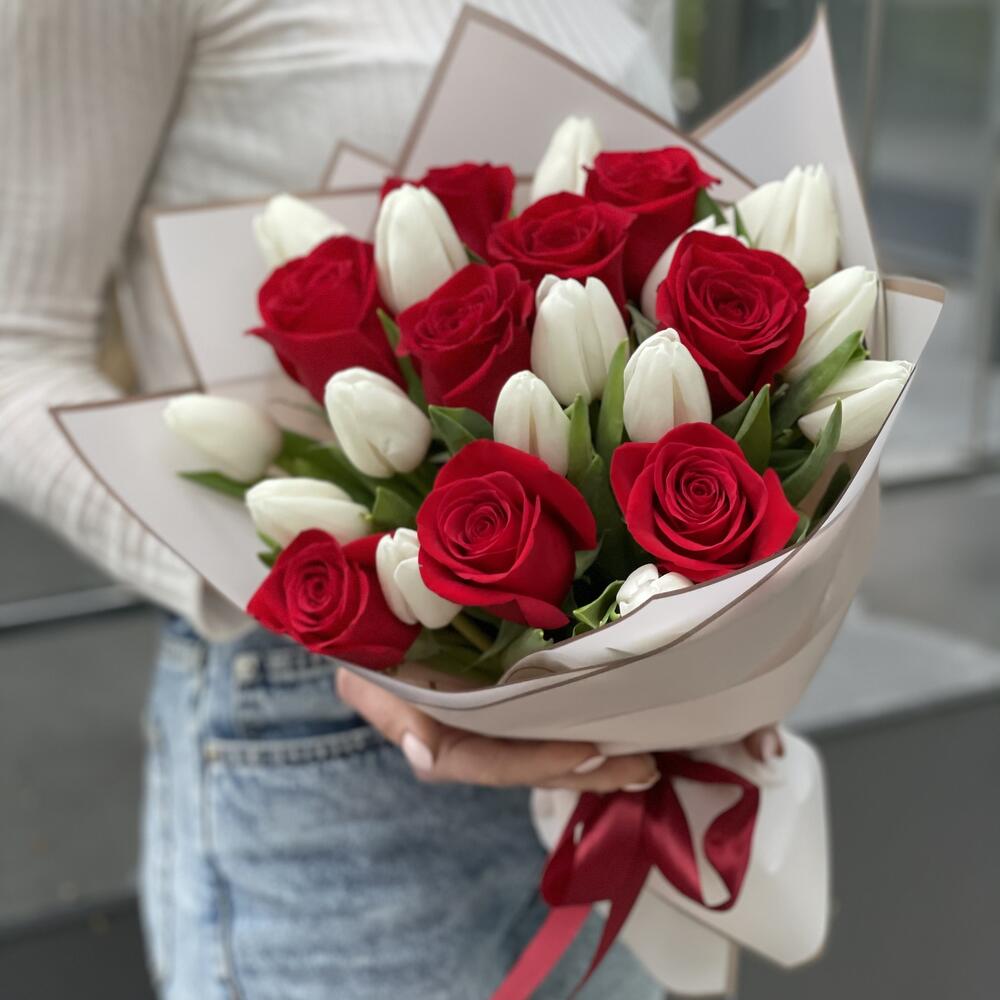 Букет Идиллия из красных роз и белых тюльпанов