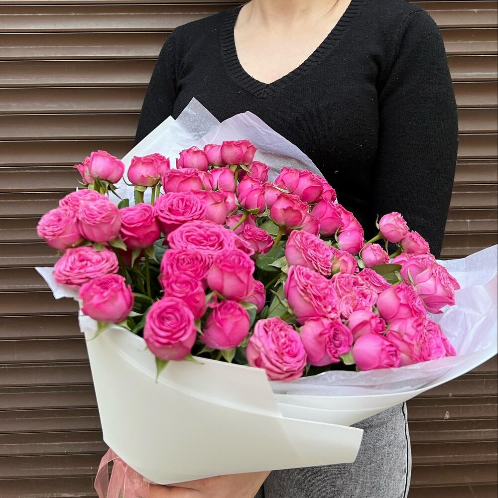 Лента атласная – 1 шт.Пленка матовая – 2 шт.Пионовидная роза кустовая – 15 шт.