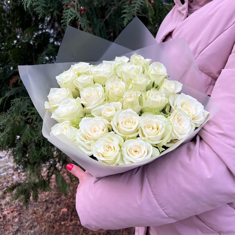 Роза белая – 25 шт.Пленка матовая – 1 шт.Лента атласная – 1 шт.