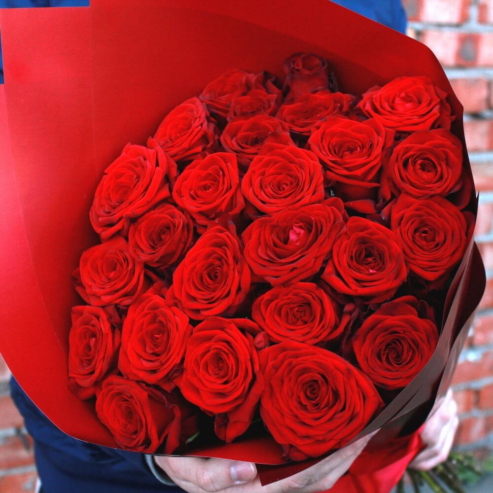 Букет из 25 красных роз в упаковке