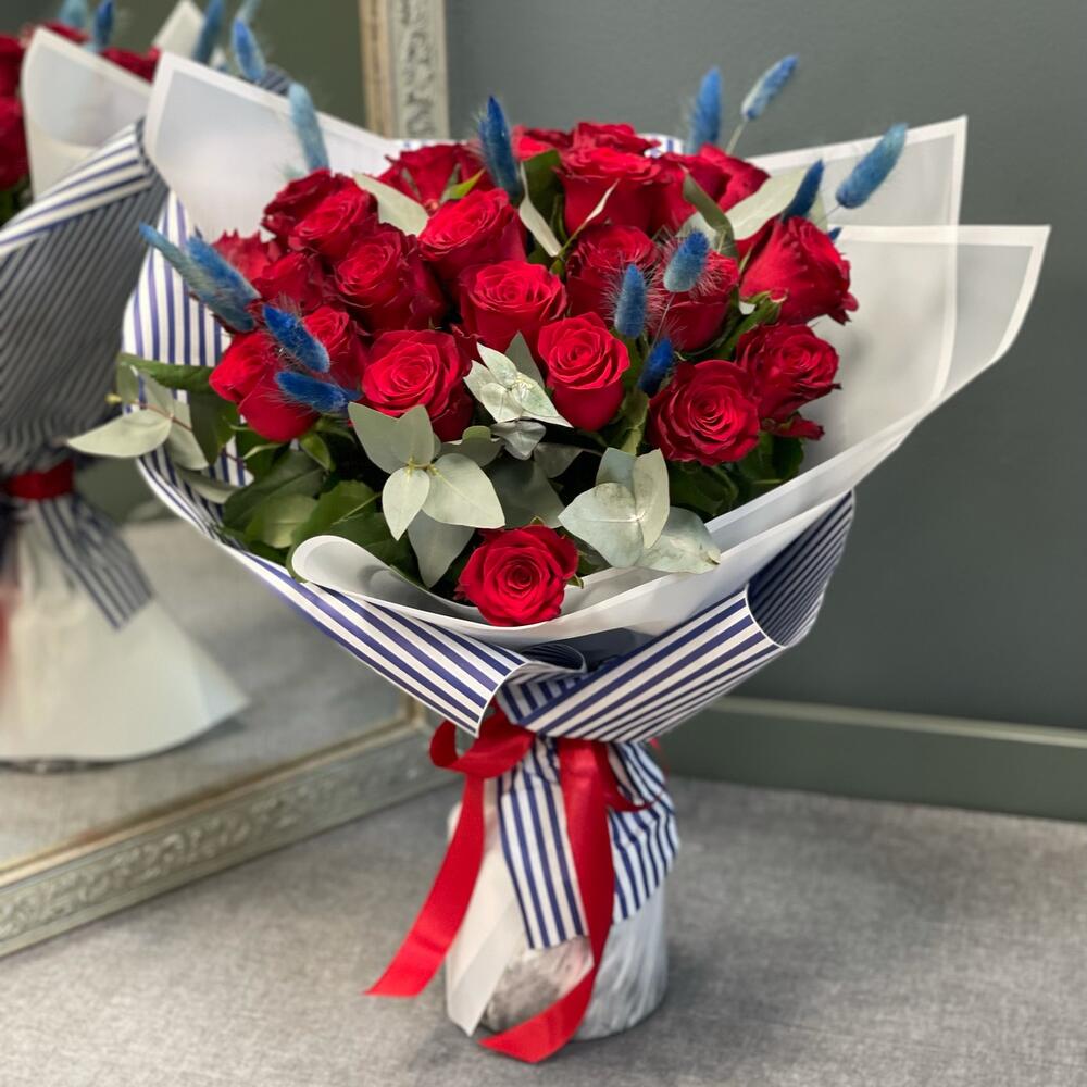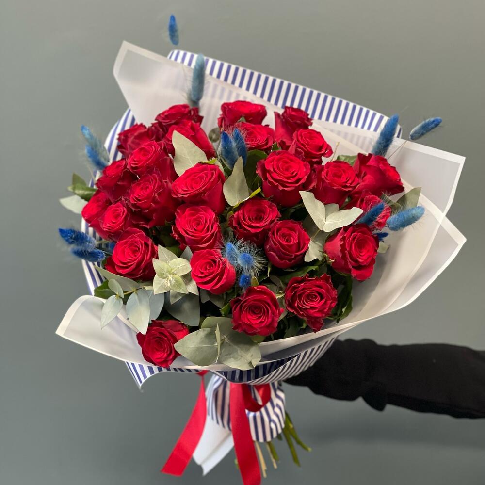 Лента – 1 шт.Эвкалипт – 3 шт.Роза одноголовая – 25 шт.Лагурус (сухоцвет) – 20 шт.бумага упаковочная – 1 шт.