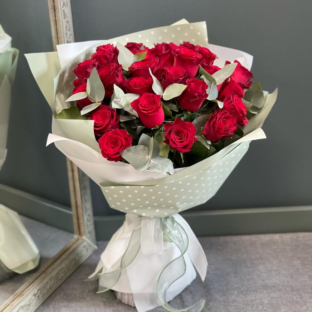 Роза одноголовая – 25 шт.Эвкалипт – 3 шт.бумага упаковочная – 1 шт.Лента – 1 шт.