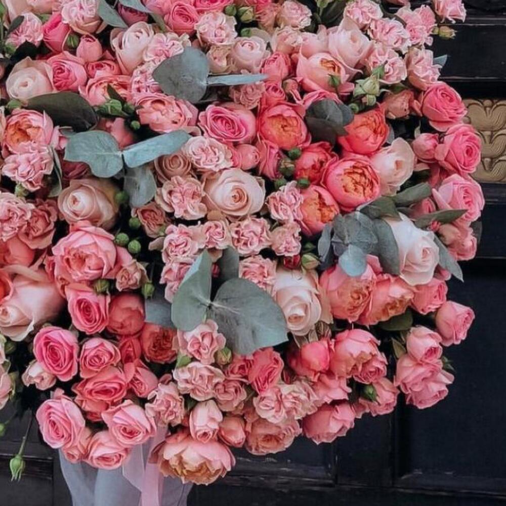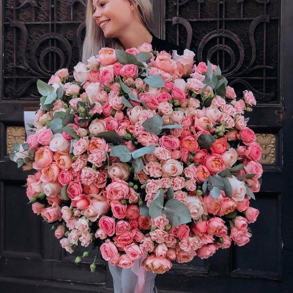розы пионовидные микс – 301 шт.Эвкалипт – 15 шт.Лента атласная – 2 шт.Открыточка с вашими пожеланиями – 1 шт.хорошее настроение – 100 шт.инструкция по уходу за цветами – 1 шт.коробка переноска – 1 шт.Кризал – 1 шт.