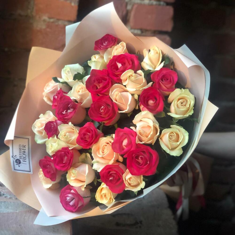 Букет из 35 красных и кремовых роз в стильной упаковке “Красно-кремовое боке”