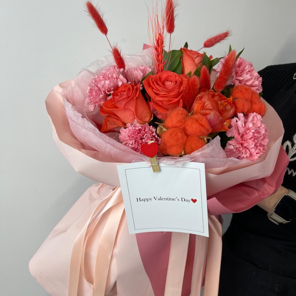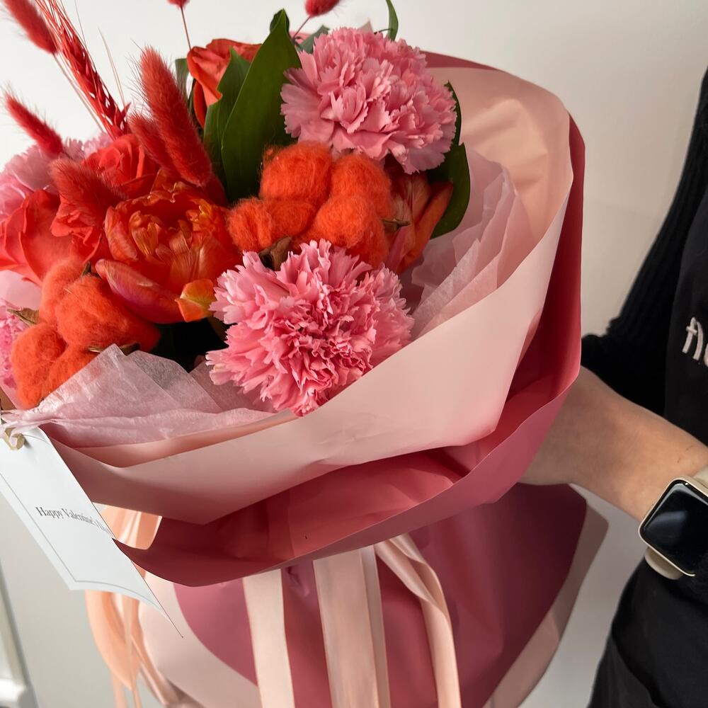 Роза оранжевая – 3 шт.Тюльпан – 2 шт.диантуса – 5 шт.Лагурус (сухоцвет) – 6 шт.Салал – 3 шт.Тишью розовая – 2 шт.Пленка матовая – 4 шт.Открытка – 1 шт.