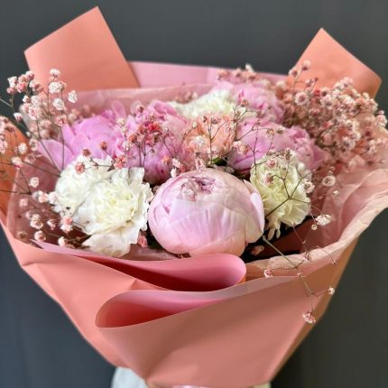 Круглая корзина из пионовидных роз, белых гвоздик и махровых лизиантусов