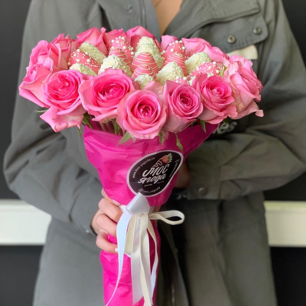 Клубника в шоколаде – 19 шт.Роза розовая – 19 шт.бумага упаковочная – 1 шт.Лента атласная – 1 шт.Открытка – 1 шт.