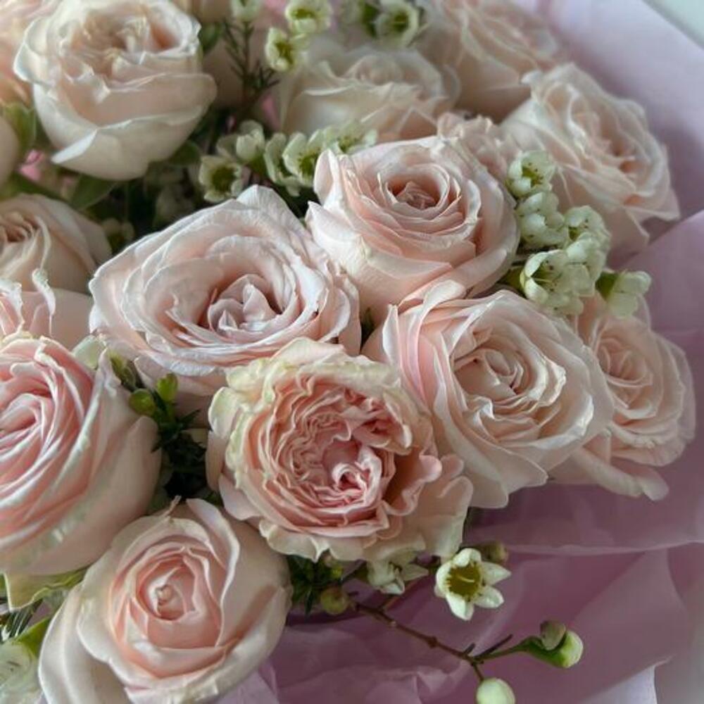 Роза кустовая пионовидная – 5 шт.хаменлациум – 1 шт.Дизайнерская упаковка – 1 шт.Атласная лента – 1 шт.