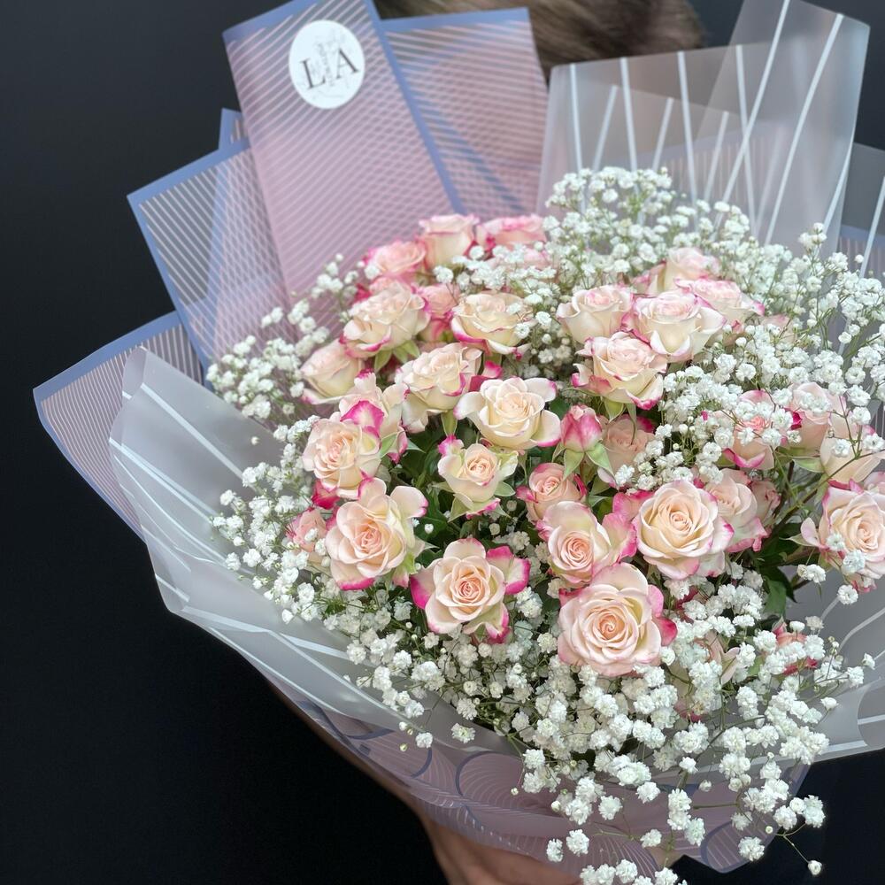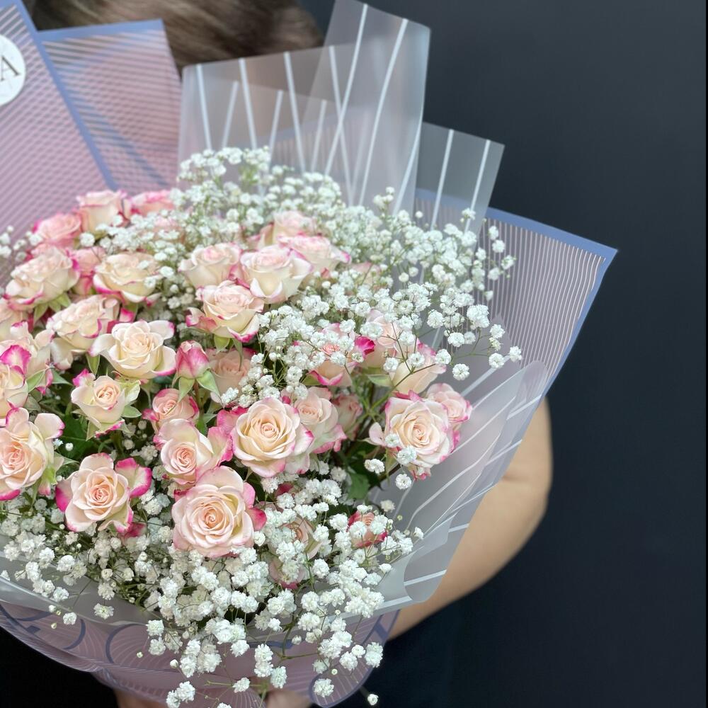 Гипсофила – 6 шт.Лента атласная – 2 шт.Упаковка дизайнерская – 6 шт.Кустовая роза 60 см – 7 шт.