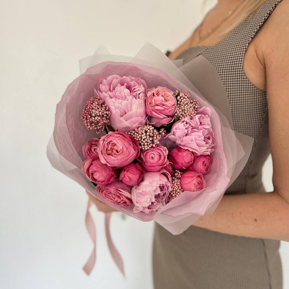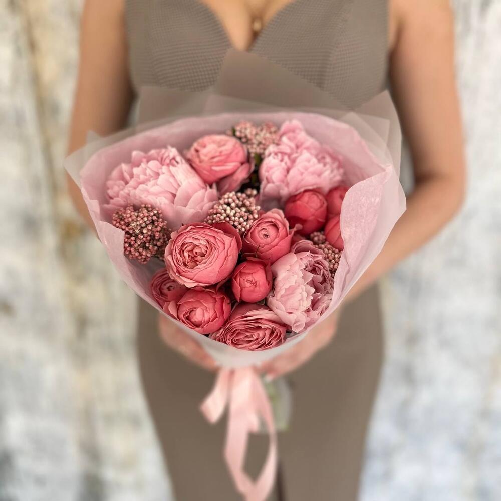 Озотамнус – 4 шт.Пион – 3 шт.Кустовая пионовидная роза – 2 шт.Дизайнерская упаковка – 3 шт.