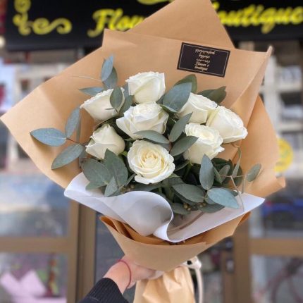 Упаковка дизайнерская – 3 шт. Пионовидная кустовая роза – 9 шт. Открыточка с вашими пожеланиями – 1 шт. инструкция по уходу за цветами – 1 шт.
