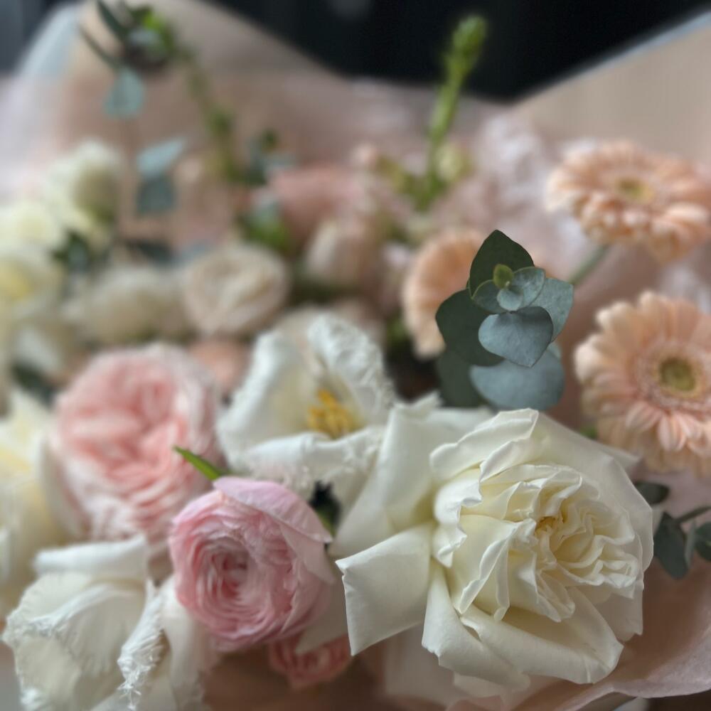 Букет из пионовидныз роз, ранункулюсов и тюльпанов