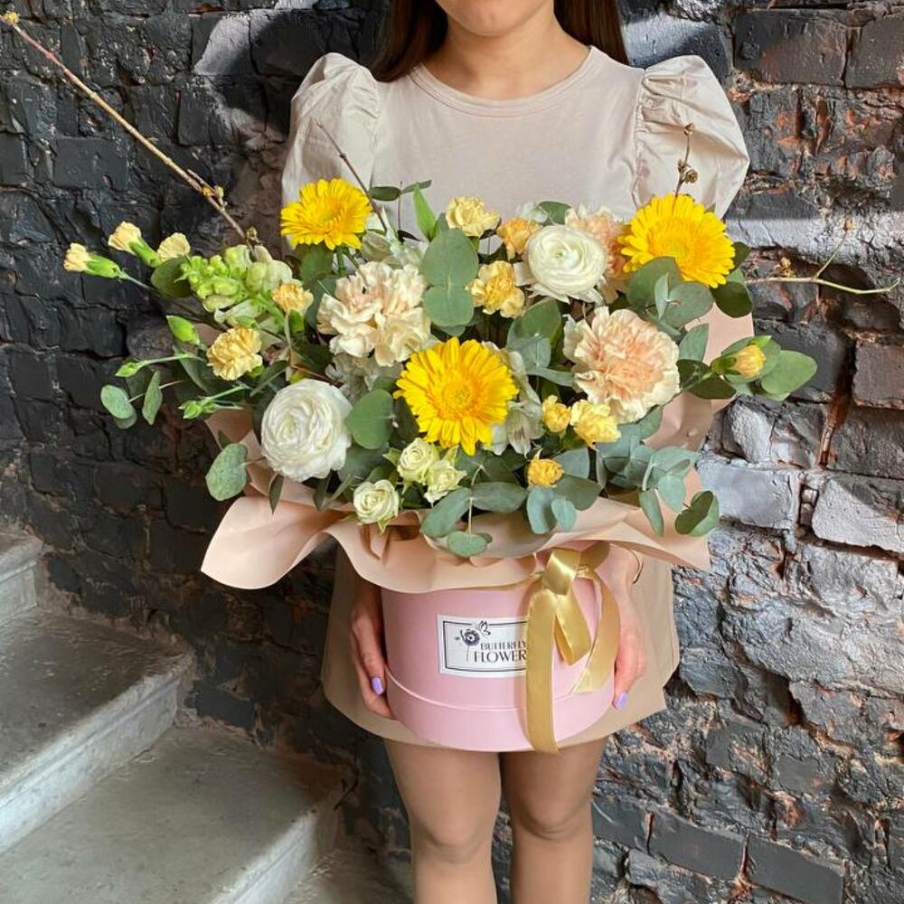 Букет из ранункулюсов, гвоздик, гербер, кустовых роз и эвкалипта в стильной шляпной коробке “Солнце Афин”
