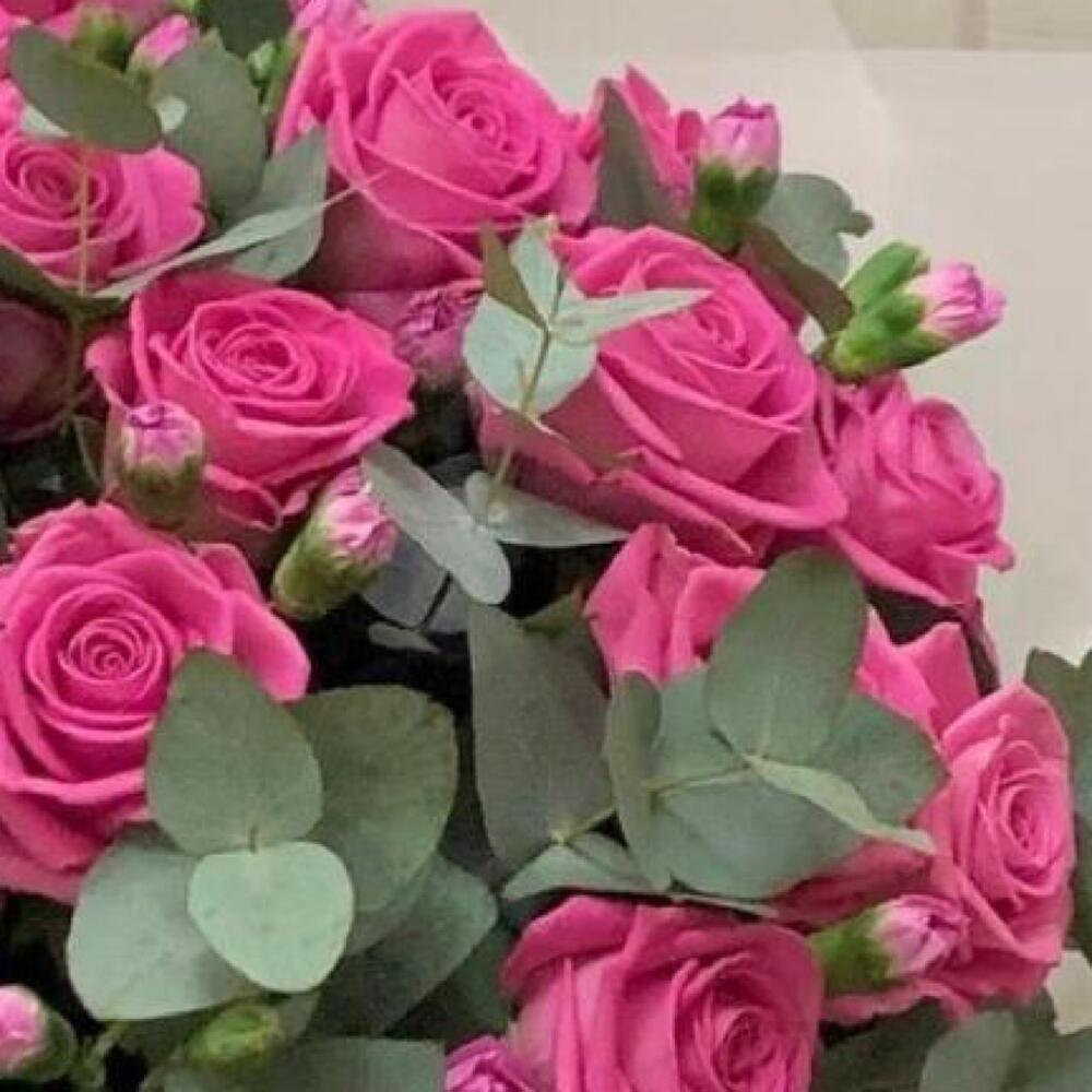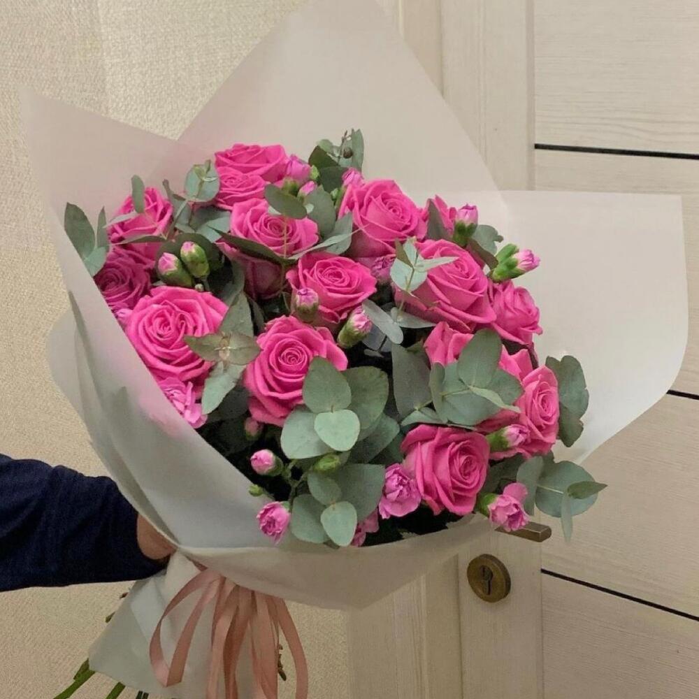 Букет из розовых роз и эвкалипта «Искушение»