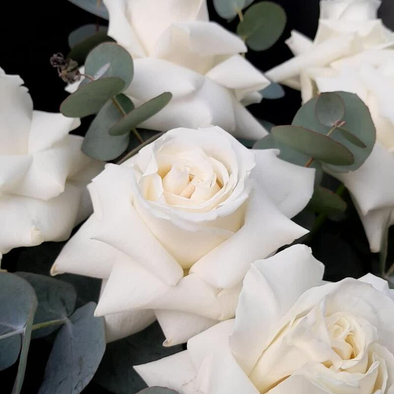 Эвкалипт – 6 шт.Лента атласная – 3 шт.Упаковка дизайнерская – 4 шт.Роза французская – 13 шт.