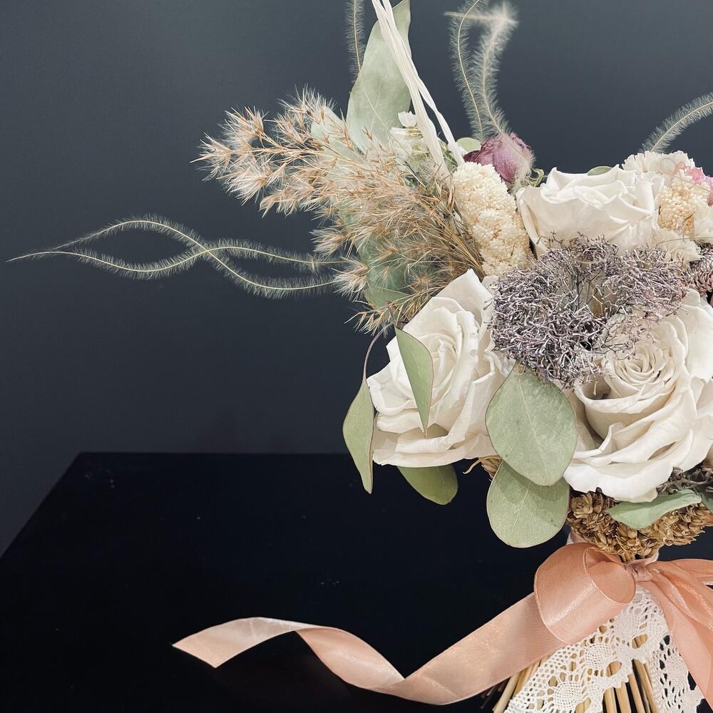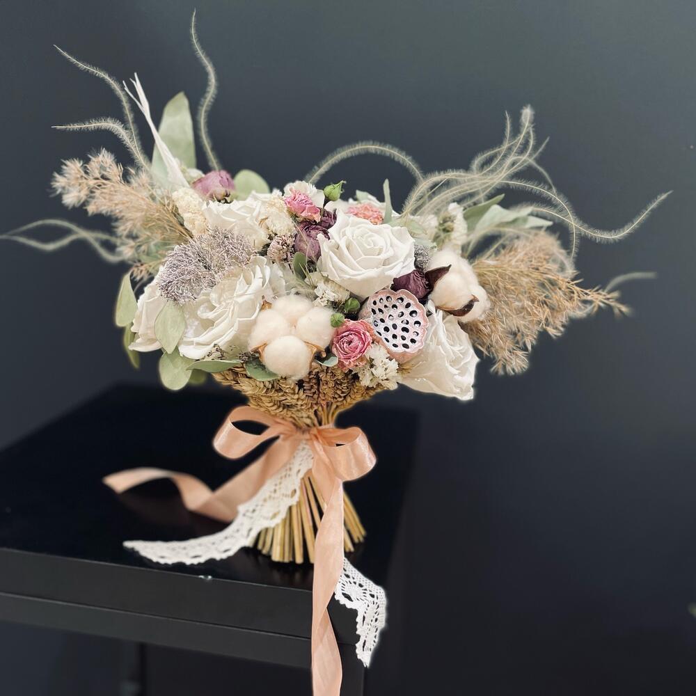 Роза стабилизированная – 6 шт.Роза сухоцвет – 15 шт.Хлопок (сухоцвет) – 6 шт.Эвкалипт сухоцвет – 7 шт.Статица – 11 шт.трахелиум сухоцвет – 3 шт.Лотос сухой – 1 шт.ковыль связка – 3 шт.Колоски – 31 шт.