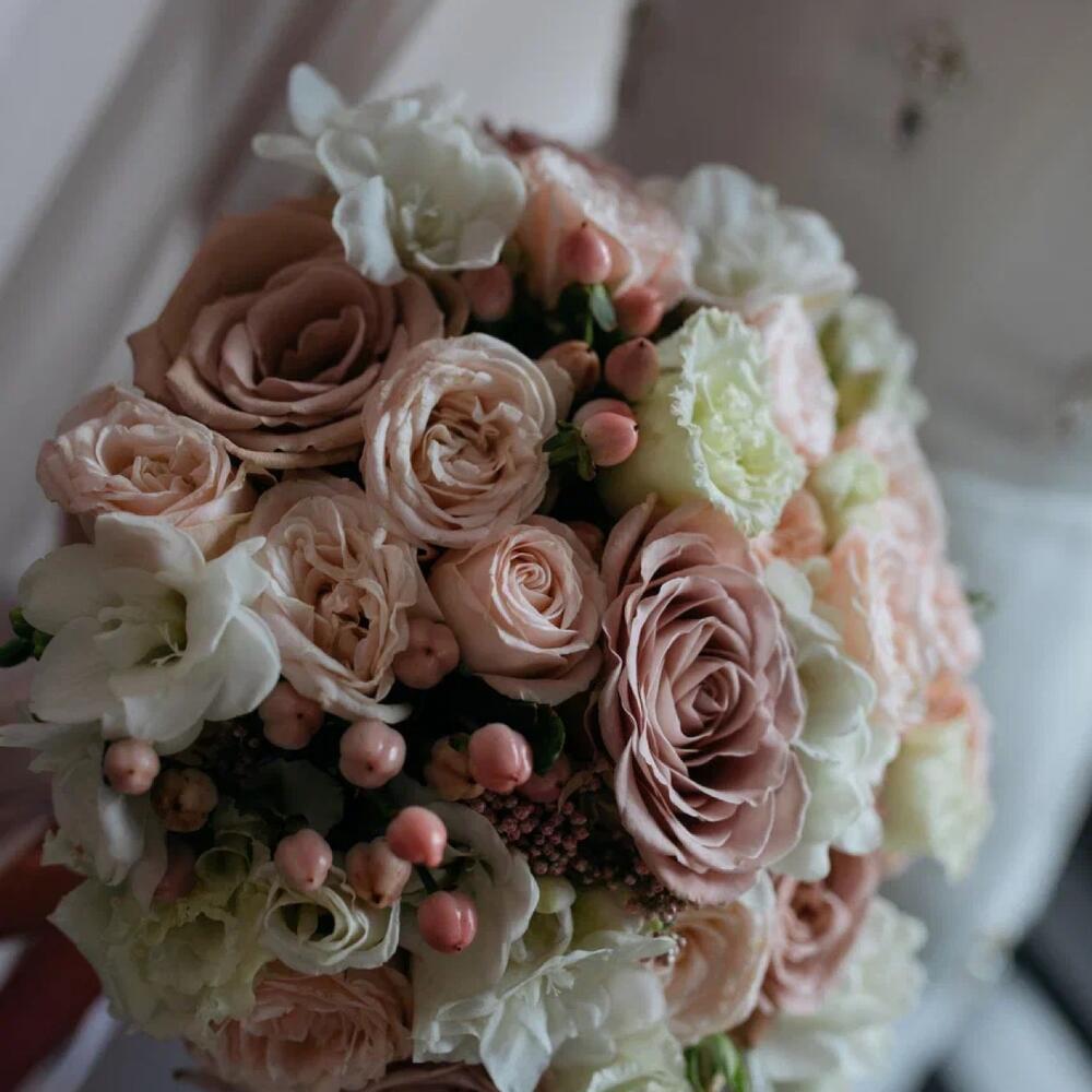 Гиперикум – 3 шт.Лизиантус – 3 шт.Озотамнус – 2 шт.Фрезия – 7 шт.Пионовидная роза – 7 шт.Атласная лента – 3 шт.Кустовая пионовидная роза – 9 шт.