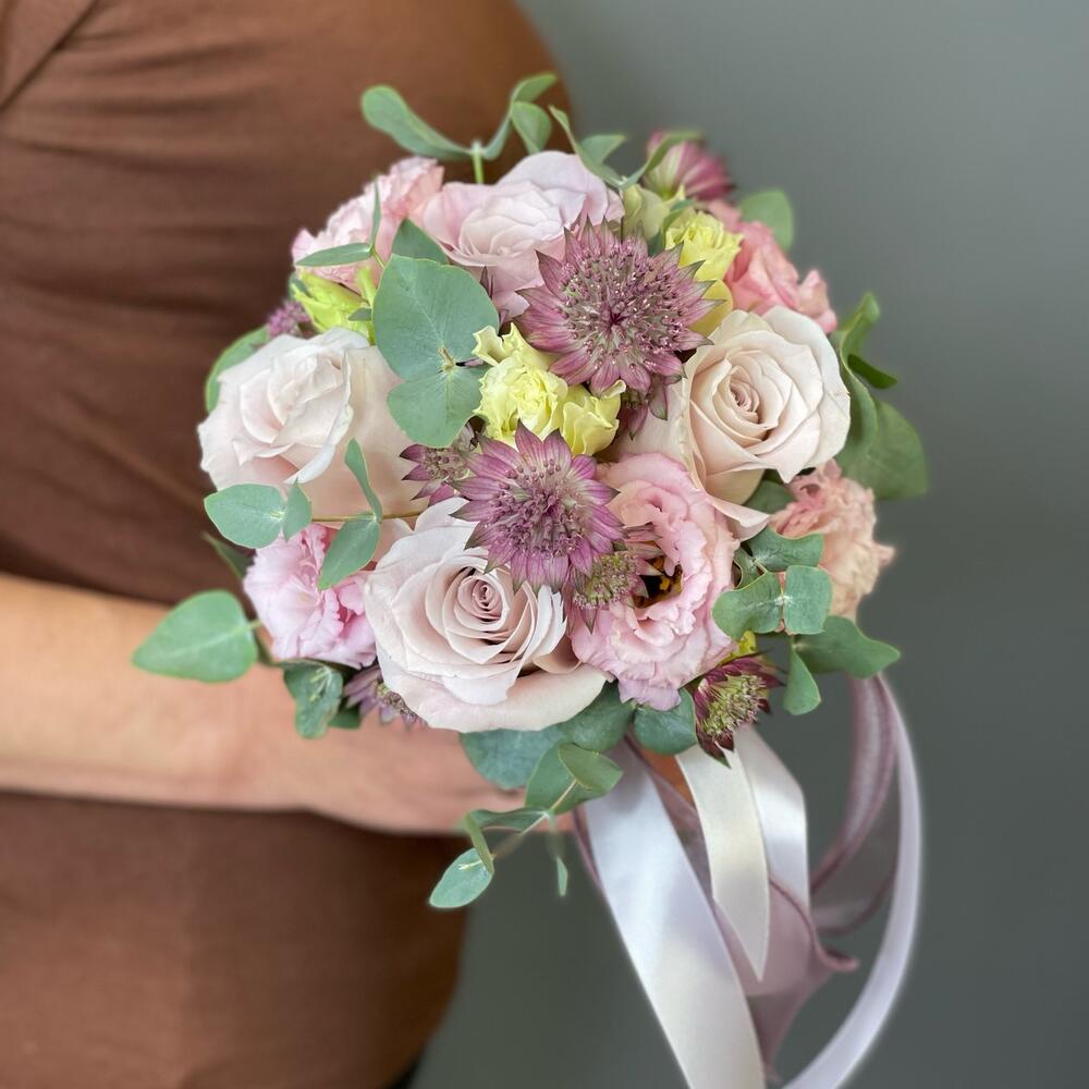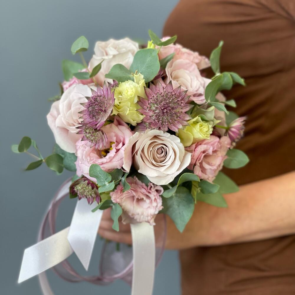 Лента – 2 шт.Лизиантус – 2 шт.Эвкалипт – 2 шт.Роза одноголовая – 5 шт.Астранция – 3 шт.Транспортировочная коробка – 1 шт.