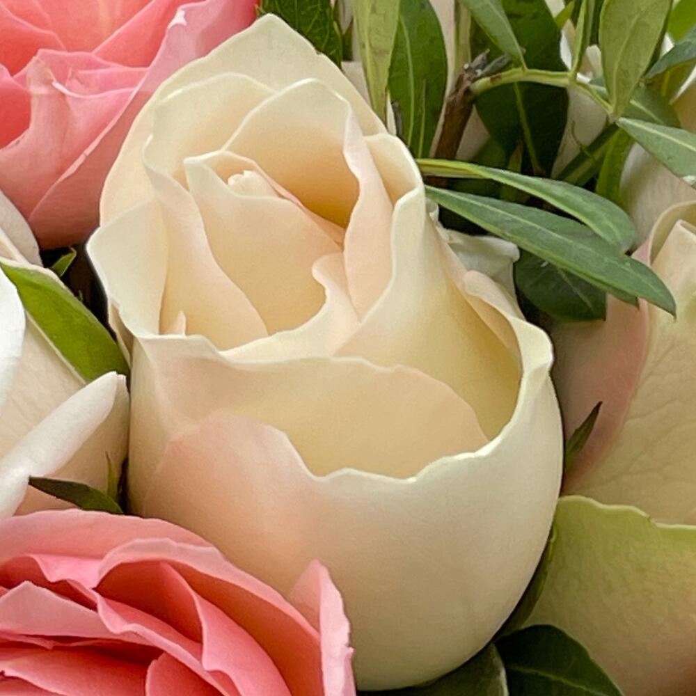 Роза кустовая – 3 шт.Роза одноголовая – 7 шт.Лента атласная – 3 шт.Фисташка – 2 шт.Роза Джульетта – 2 шт.