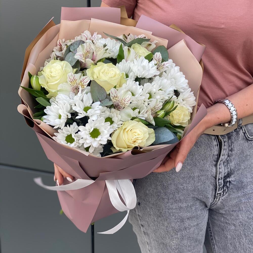 Эвкалипт – 2 шт. Хризантема – 4 шт. Роза белая мондиаль – 5 шт. Альстромерия – 6 шт. Оформление – 1 шт.