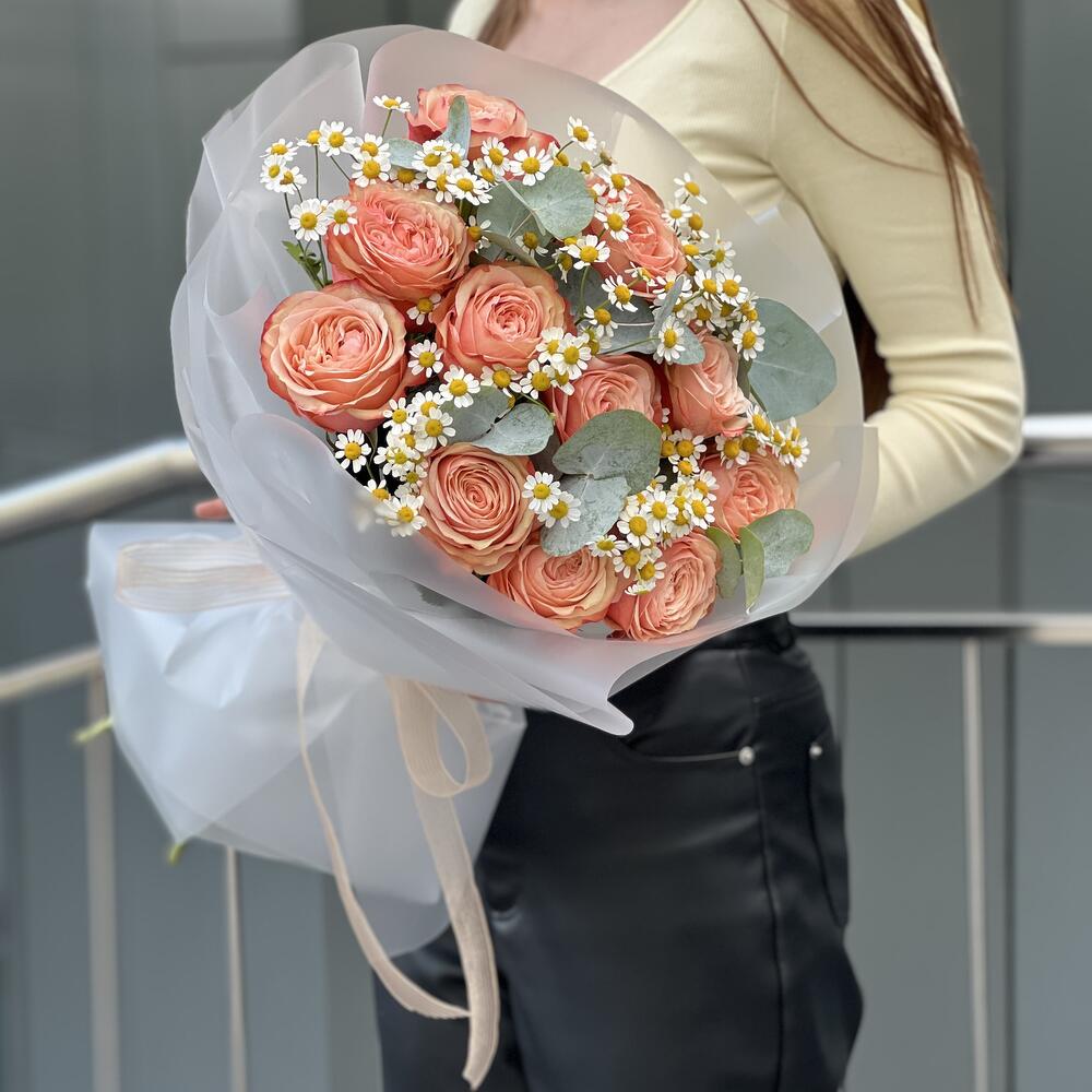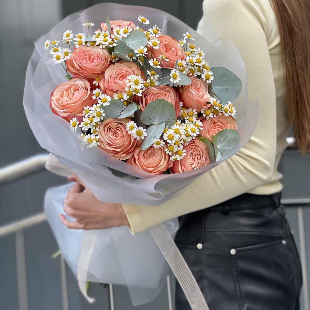 Букет из роз, ромашек и эвкалипта в оформлении!