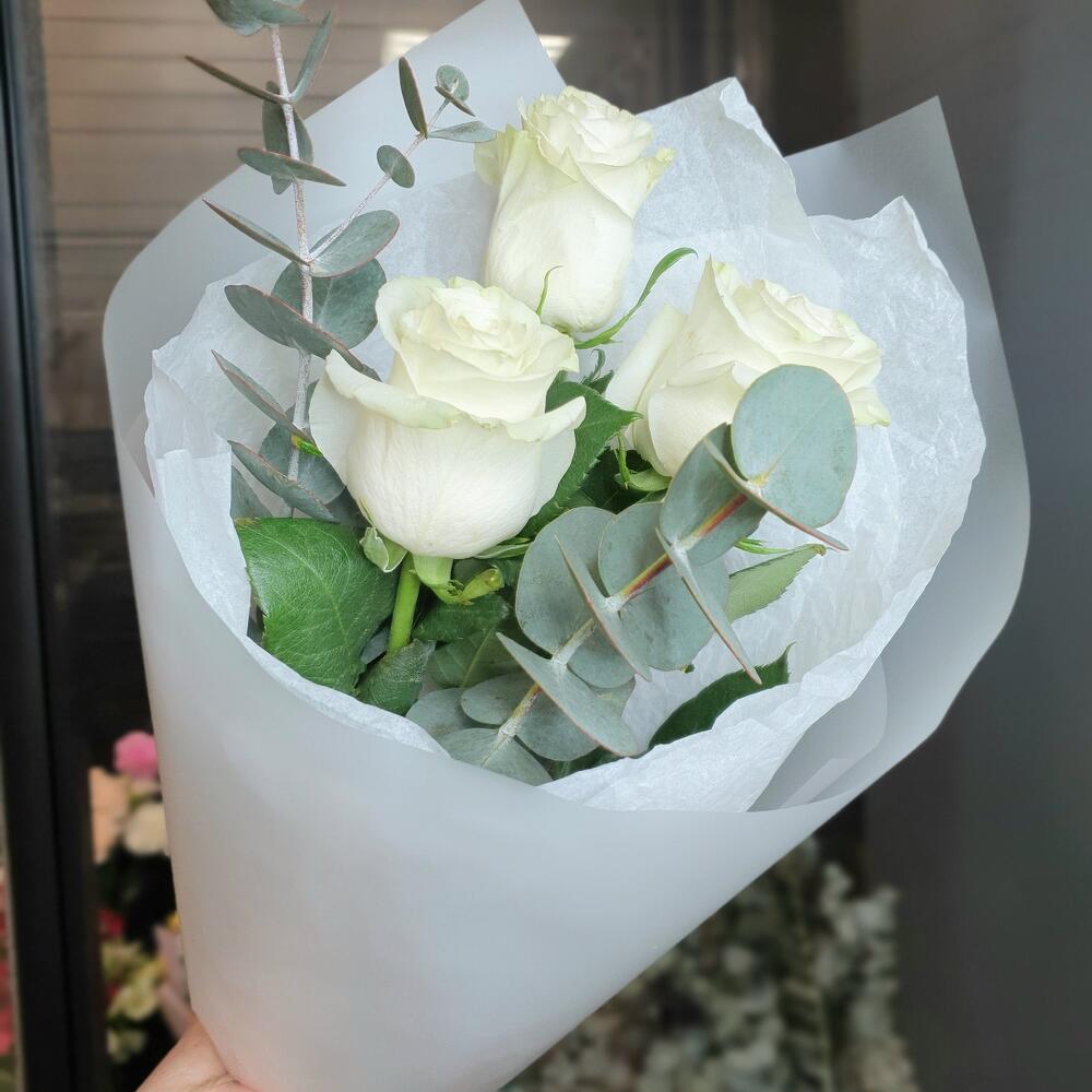 Роза – 3 шт.Эвкалипт пучок – 1 шт.Упаковка дизайнерская – 2 шт.