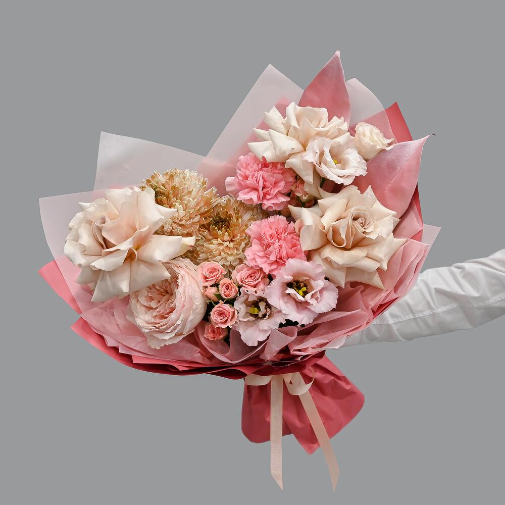 Французская роза – 3 шт.Пионовидная роза – 1 шт.Хризантема – 2 шт.Кустовая роза – 2 шт.Гвоздика – 2 шт.Эустома – 1 шт.Упаковка дизайнерская – 1 шт.