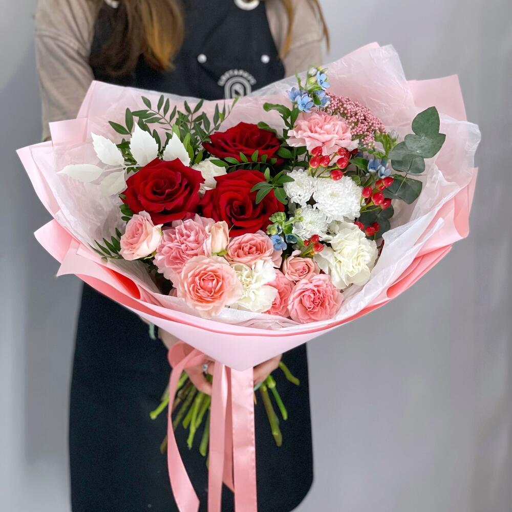 Озотамнус – 1 шт.Роза кустовая – 3 шт.Гвоздика – 5 шт.Фисташка – 2 шт.Хиперикум – 1 шт.Упаковка дизайнерская – 1 шт.Декор – 1 шт.твидия голубая – 3 шт.красные розы эквадор – 3 шт.