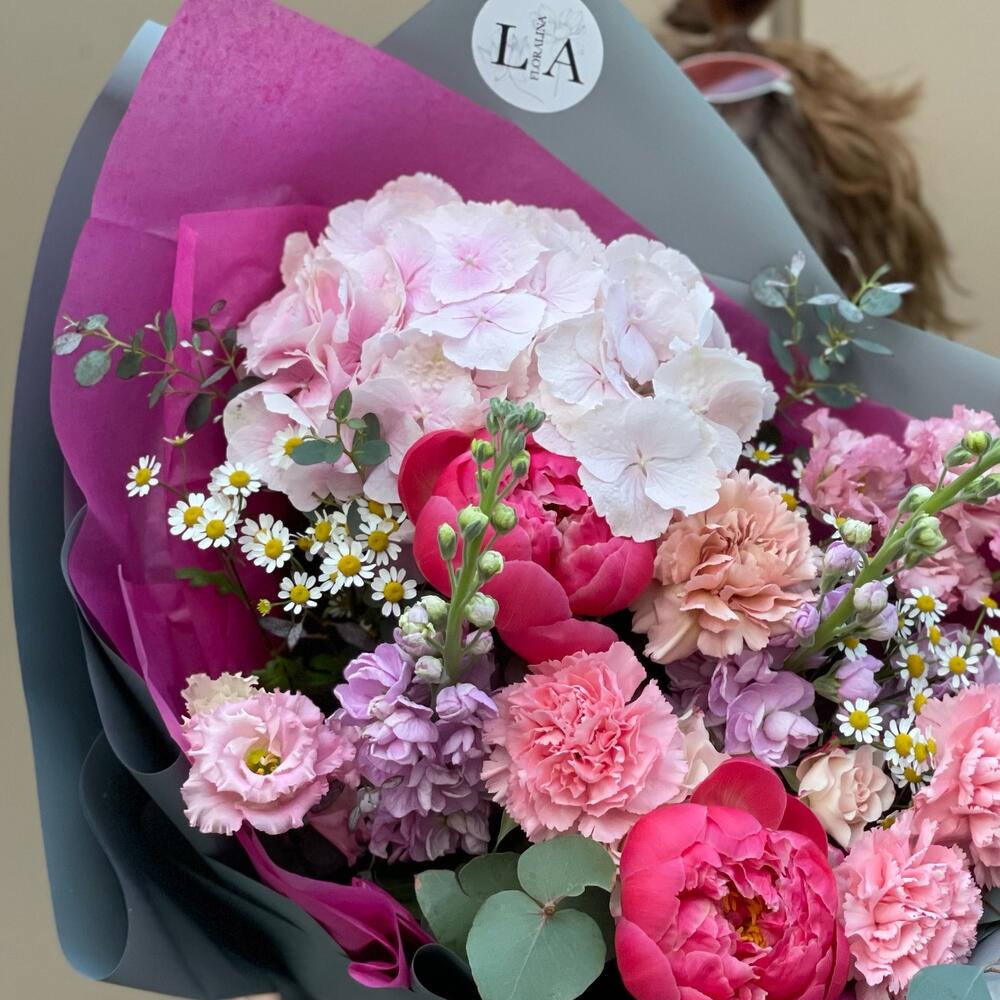 Гортензия розовая – 1 шт.Пион – 2 шт.Кустовая роза – 1 шт.Эустома – 1 шт.Маттиола – 3 шт.Гвоздика – 4 шт.Ромашка кустовая – 2 шт.Эвкалипт – 2 шт.Фисташка – 2 шт.Тишью – 2 шт.Упаковка дизайнерская – 2 шт.Лента атласная – 2 шт.