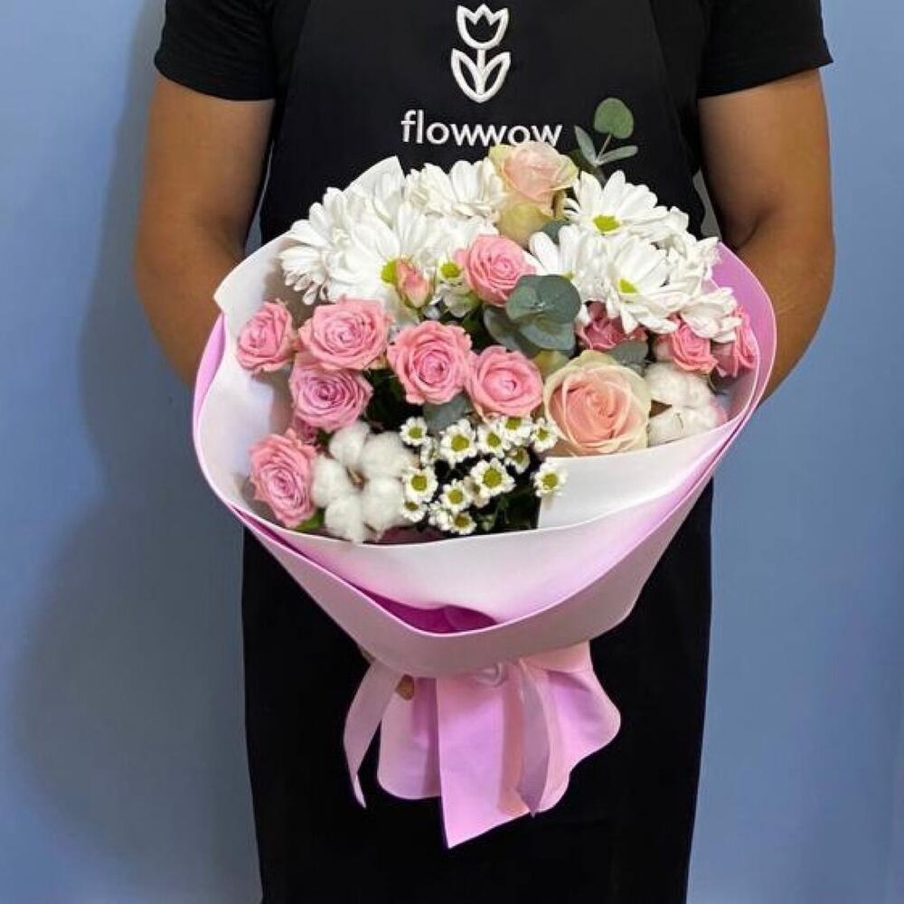 Хлопок – 2 шт.Эвкалипт – 1 шт.Лента атласная – 1 шт.Роза кустовая розовая – 3 шт.Сантини – 1 шт.Упаковка дизайнерская – 1 шт.Роза Эквадор Премиум – 2 шт.Бакарди – 2 шт.