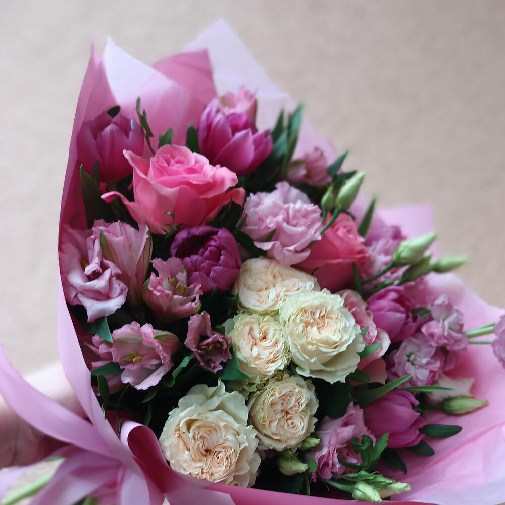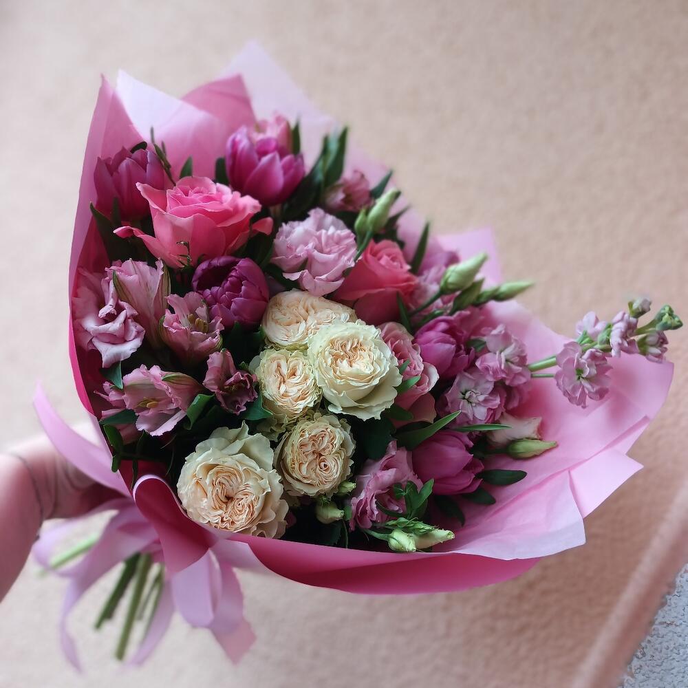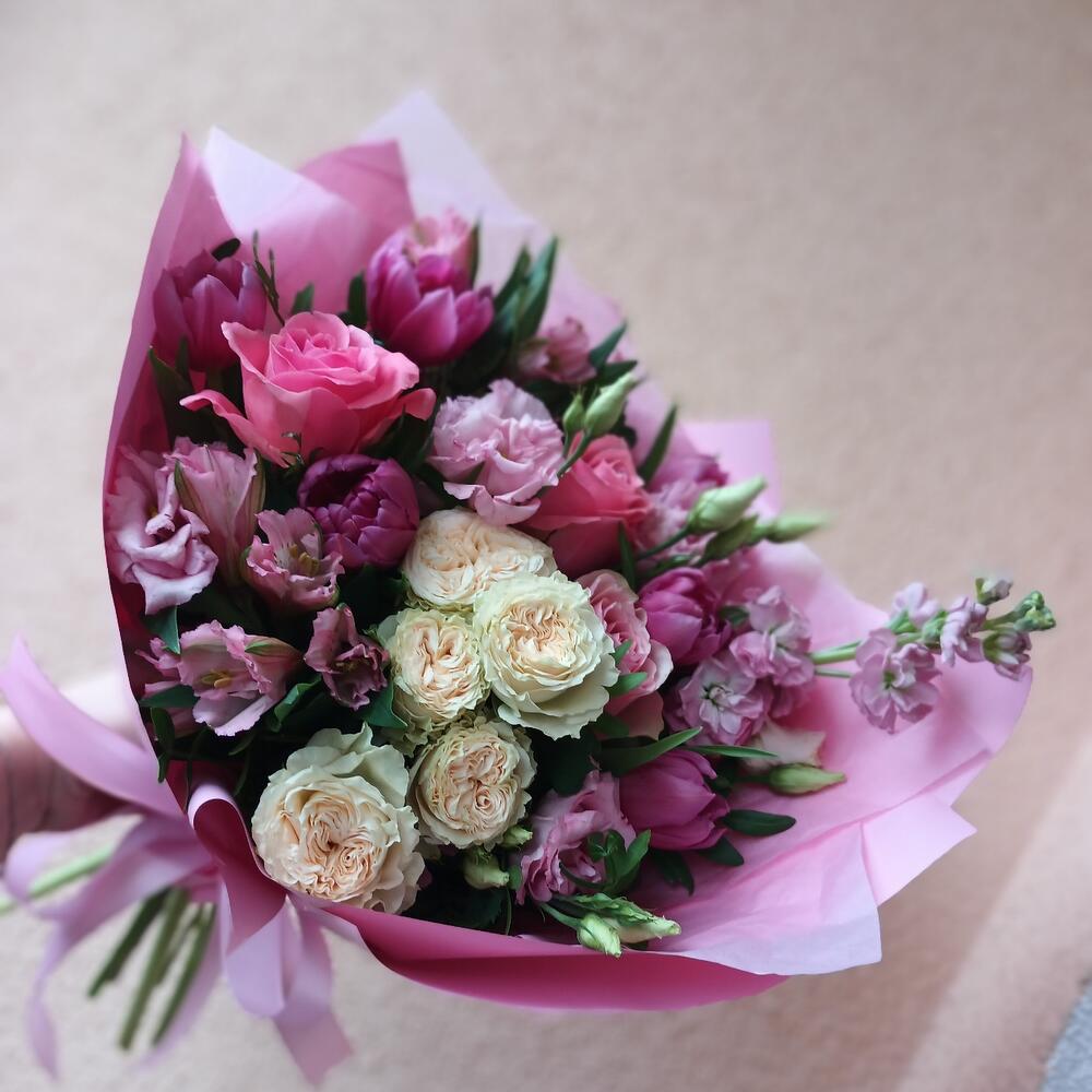 Букет с тюльпанами, пионовидными розами,матиолой,эустомой и альстромерией