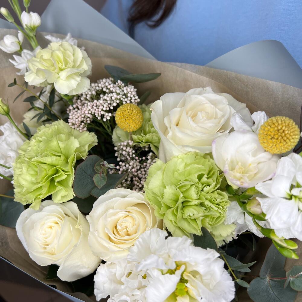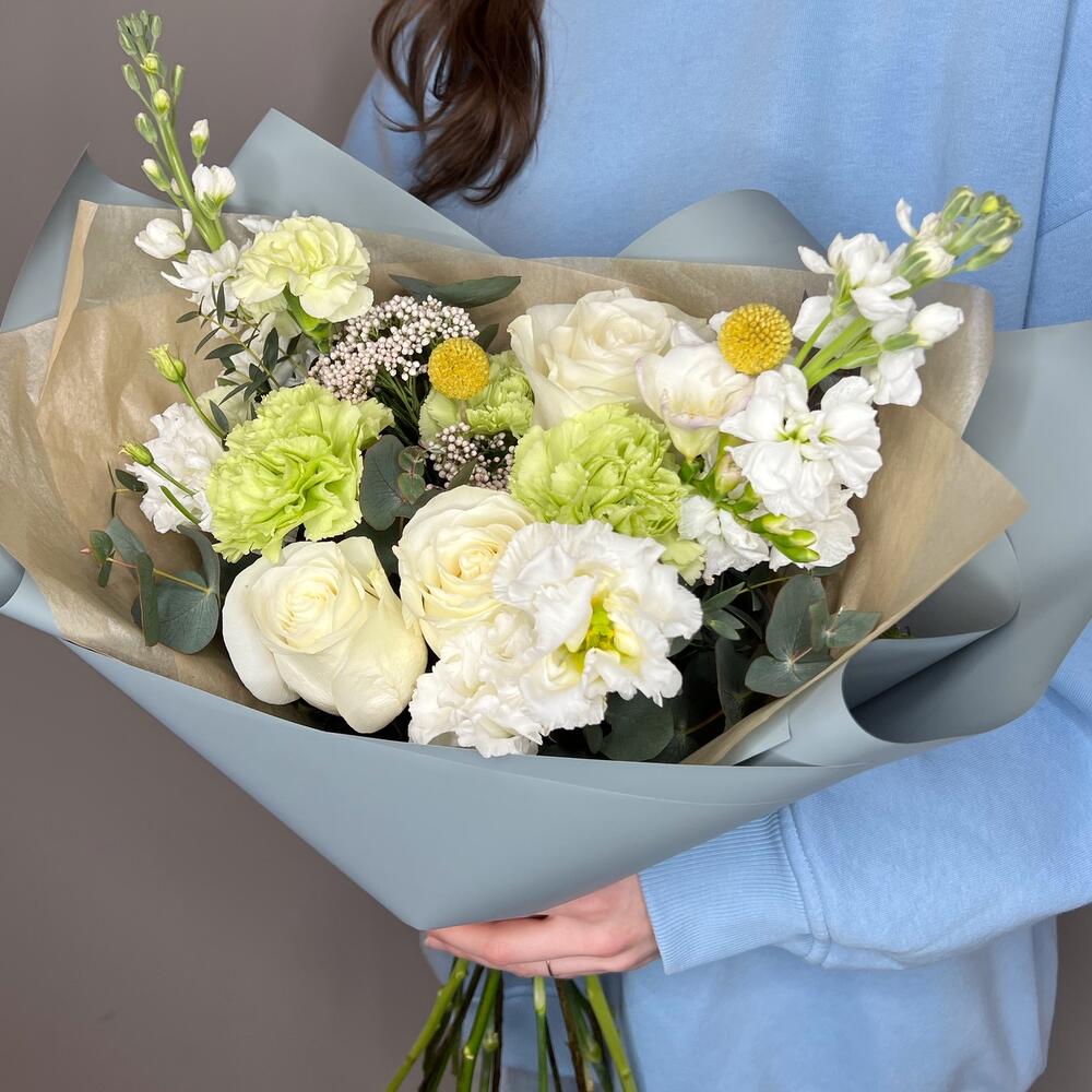 Букет в бело-зелёных оттенках с матиолой и белой розой