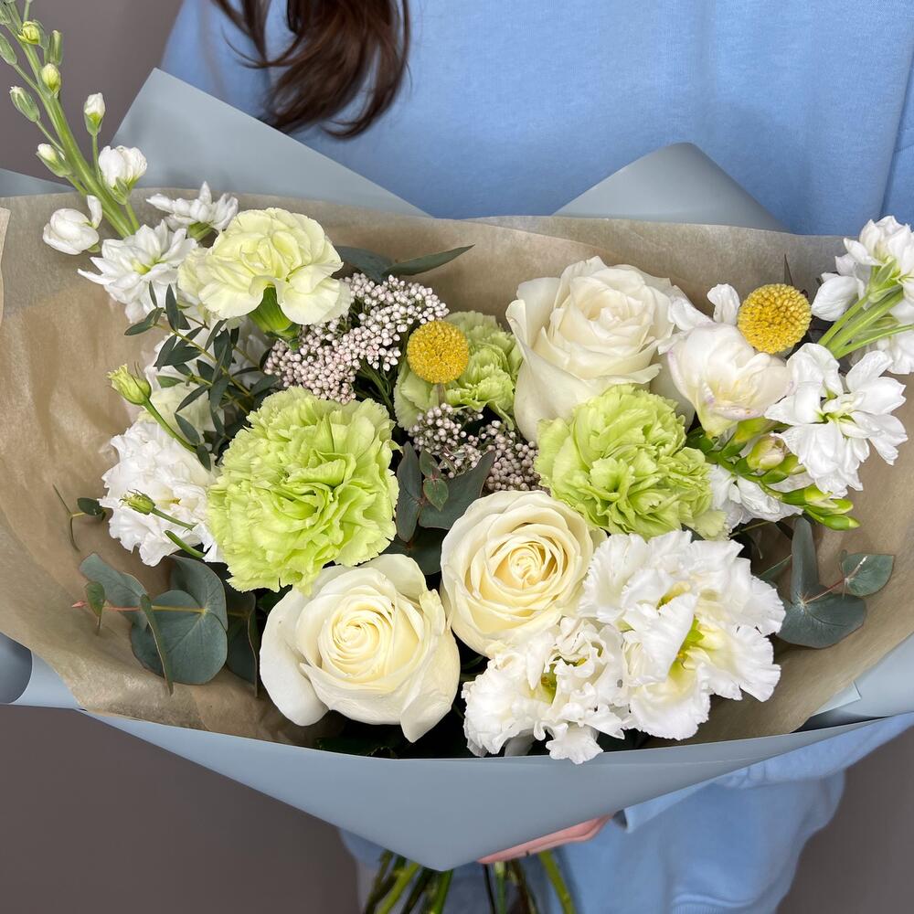 Краспедия – 2 шт.Лизиантус – 1 шт.Маттиола – 2 шт.Озотамнус – 2 шт.Роза – 3 шт.Диантус – 3 шт.Упаковка дизайнерская – 1 шт.Диантус кустовой – 1 шт.комплимент от polyanka – 1 шт.