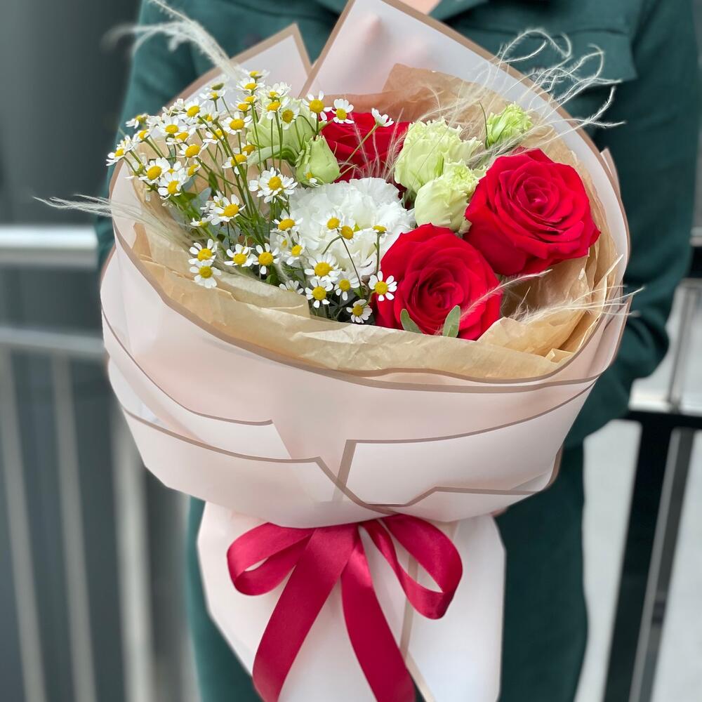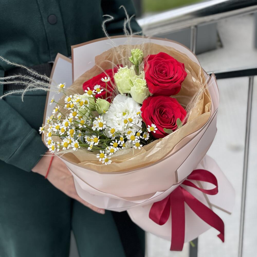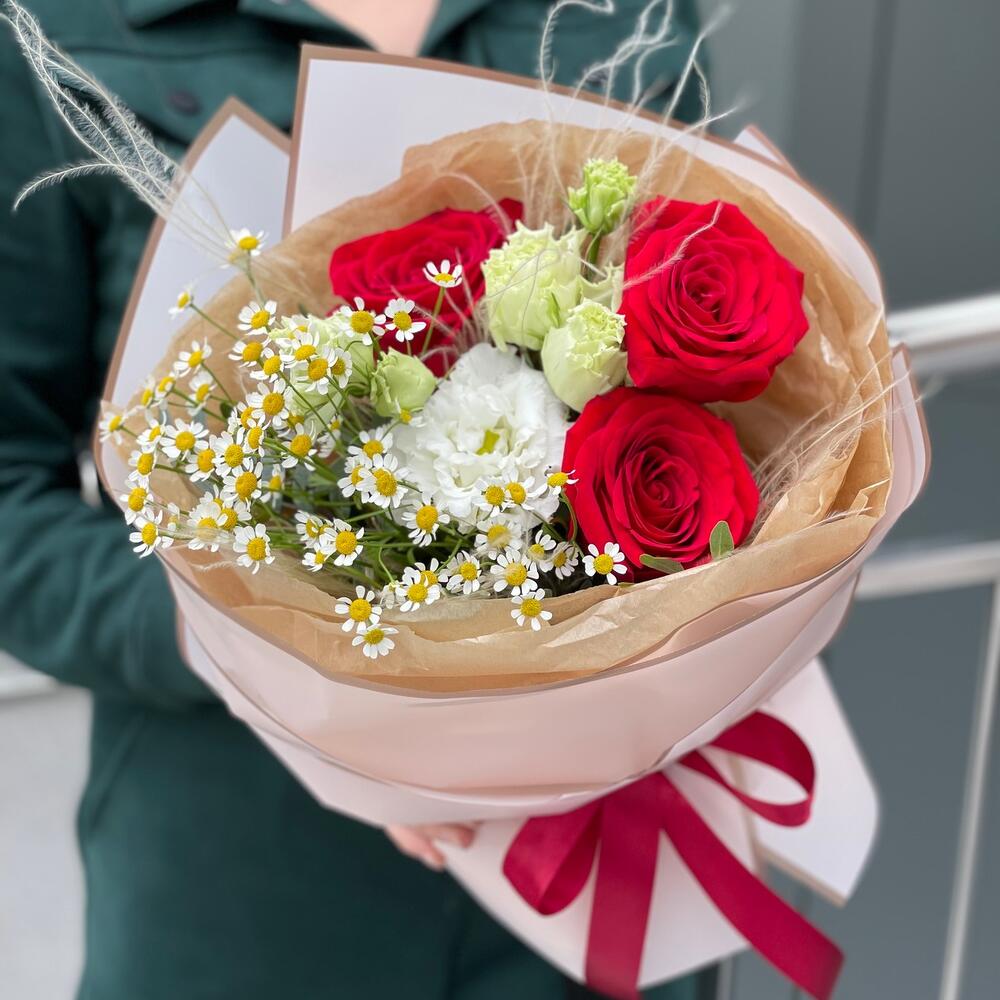 Писташ – 1 шт. Роза красная – 3 шт. Танацетум – 1 шт. Оформление – 1 шт. Стифа – 1 шт. эустома целебрик – 1 шт.
