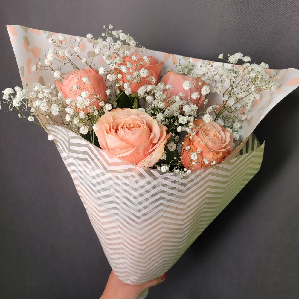 Роза Эквадор – 5 шт.Гипсофила – 2 шт.Упаковка дизайнерская – 1 шт.Лента атласная – 1 шт.